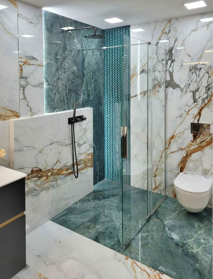 Look out for stone in deep charcoals, warm earth tones, and crisp whites with striking veining—each adding a timeless yet contemporary feel to the bathroom.