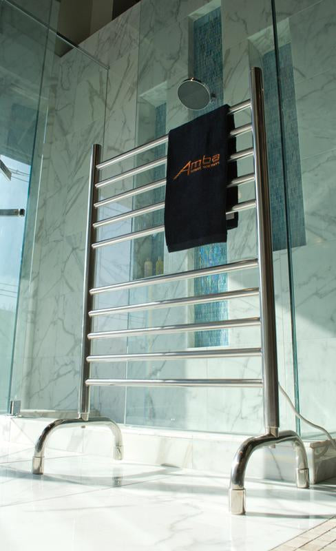 This freestanding towel warmer, with 10 polished bars in a 5-5 configuration, assembles in only a few minutes. It requires no installation. Plug it in, turn it on and you are ready to go. Light weight and portable, the towel warmer can be easily moved from the bathroom to a laundry room or pool room. Unit dimensions are 24"W x 38"H. Programmable timers can be added for additional control.
