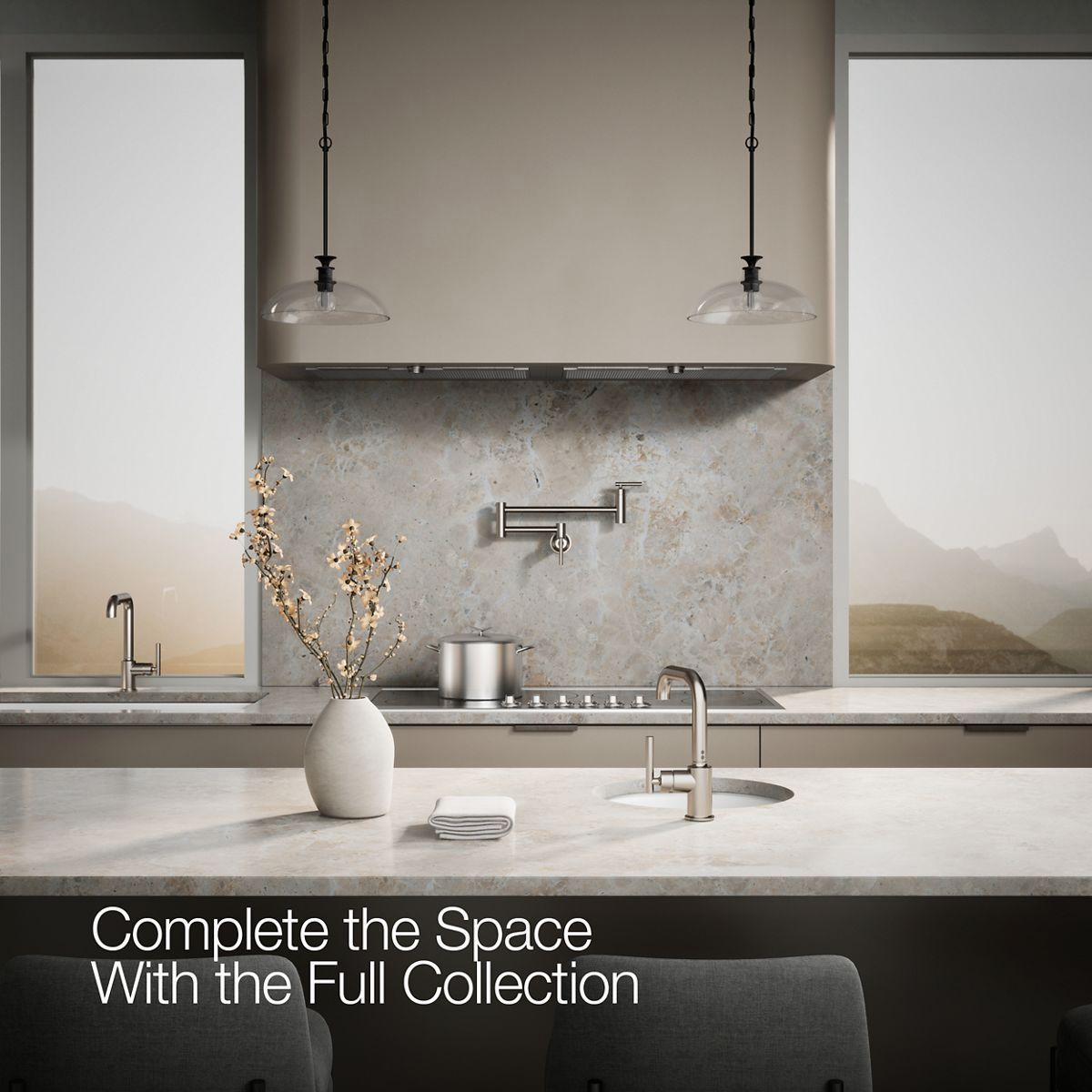 - High-arch gooseneck swing spout and 360-degree spout rotation offers superior clearance for filling pots and cleaning.