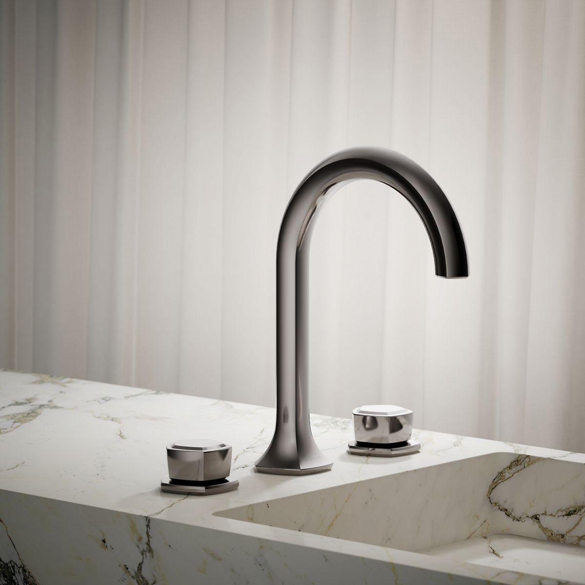 Unapologetically luxurious and truly unforgettable, Occasion bathroom faucets and accessories draw inspiration from 1960s Hollywood glamour and extravagance. Fashioned after the era’s sleek dress lines and bold car designs, the Occasion collection reflects graceful elegance, blending classic midcentury and modern design. Customize your bath with the collection’s distinctive pentagonal accents, faceted bases, flowing lines, and delicate edges. Choose a spout, handles, and finish to build your own signature design. Pair these elegant, minimalist knob handles with valves with your choice of Occasion sink faucet spout for a look as fashionable as it is functional.