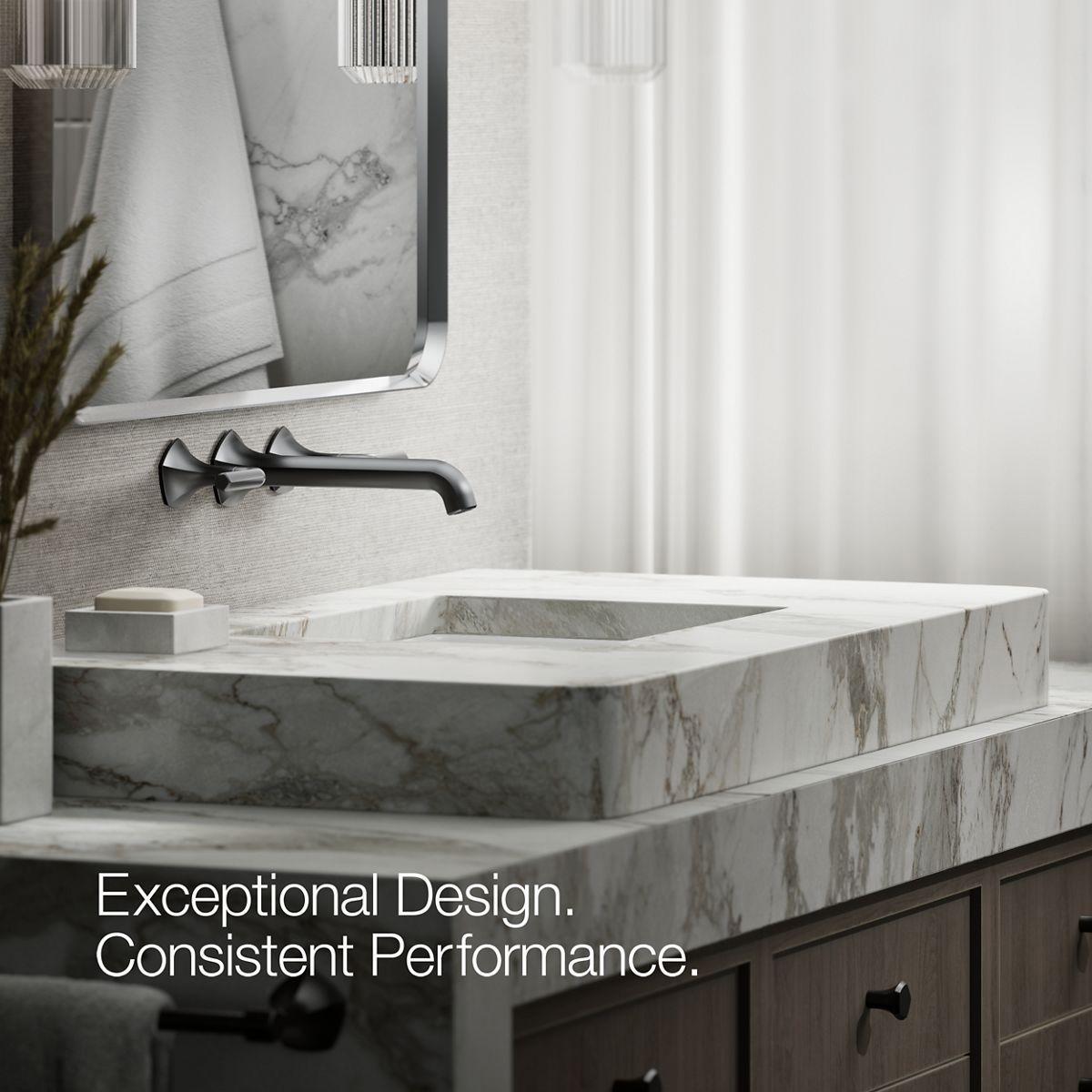 Unapologetically luxurious and truly unforgettable, Occasion bathroom faucets and accessories draw inspiration from 1960s Hollywood glamour and extravagance. Fashioned after the era’s sleek dress lines and bold car designs, the Occasion collection reflects graceful elegance, blending classic midcentury and modern design. Customize your bath with the collection’s distinctive pentagonal accents, faceted bases, flowing lines, and delicate edges. Choose a spout, handles, and finish to build your own signature design. Pair these elegant, minimalist wall-mount sink faucet trim lever handles with the Occasion wall-mount bathroom sink faucet spout for a look as fashionable as it is functional. Valve sold separately.