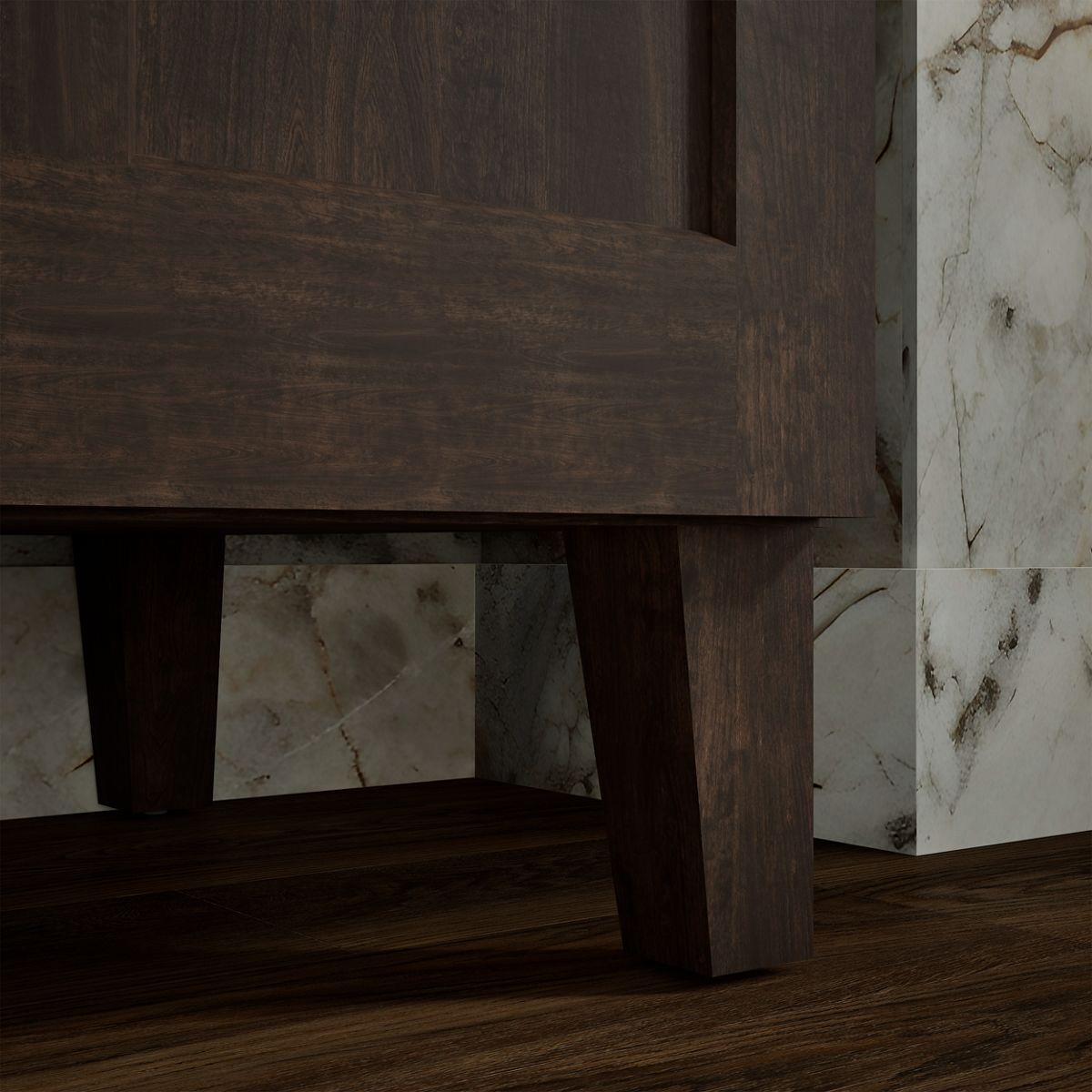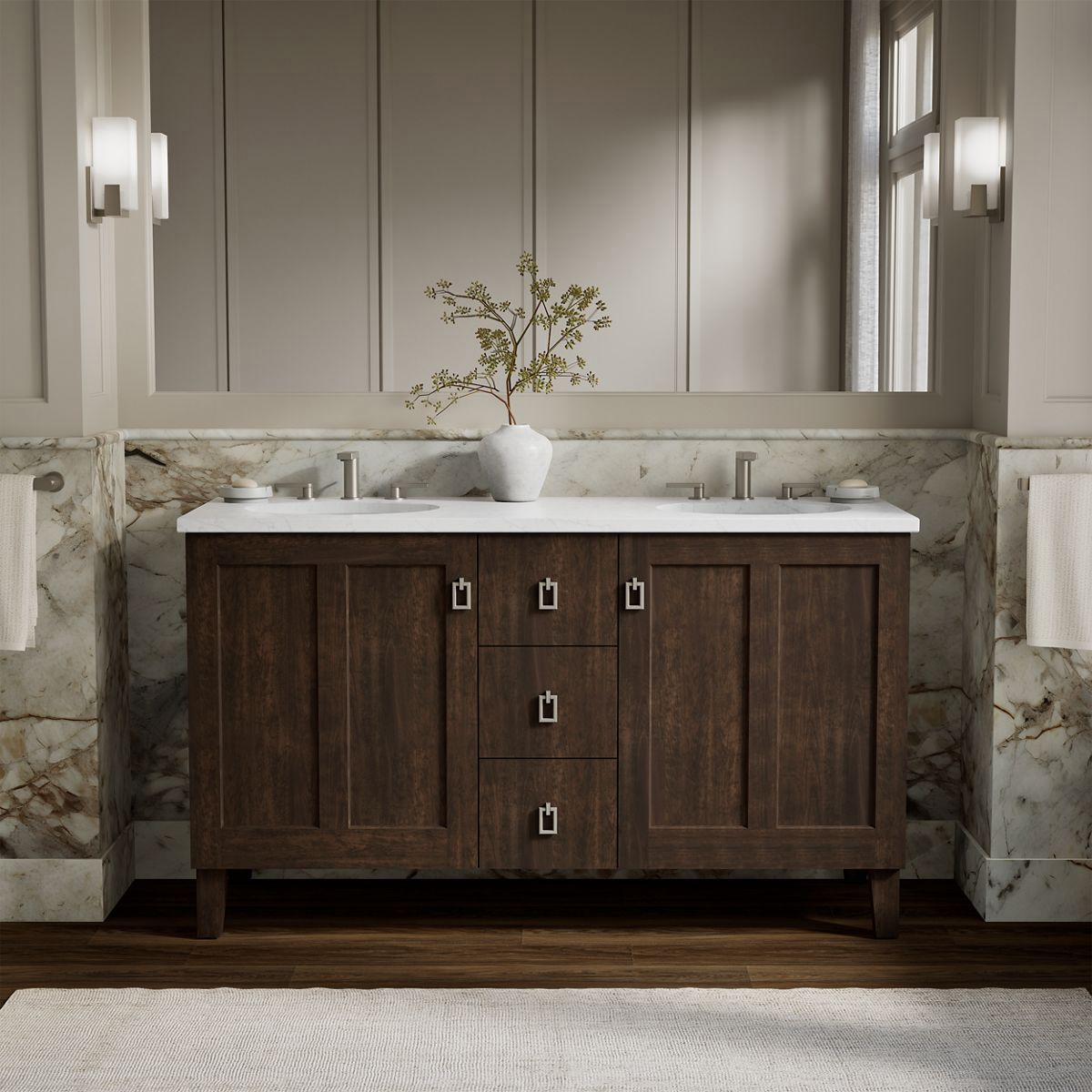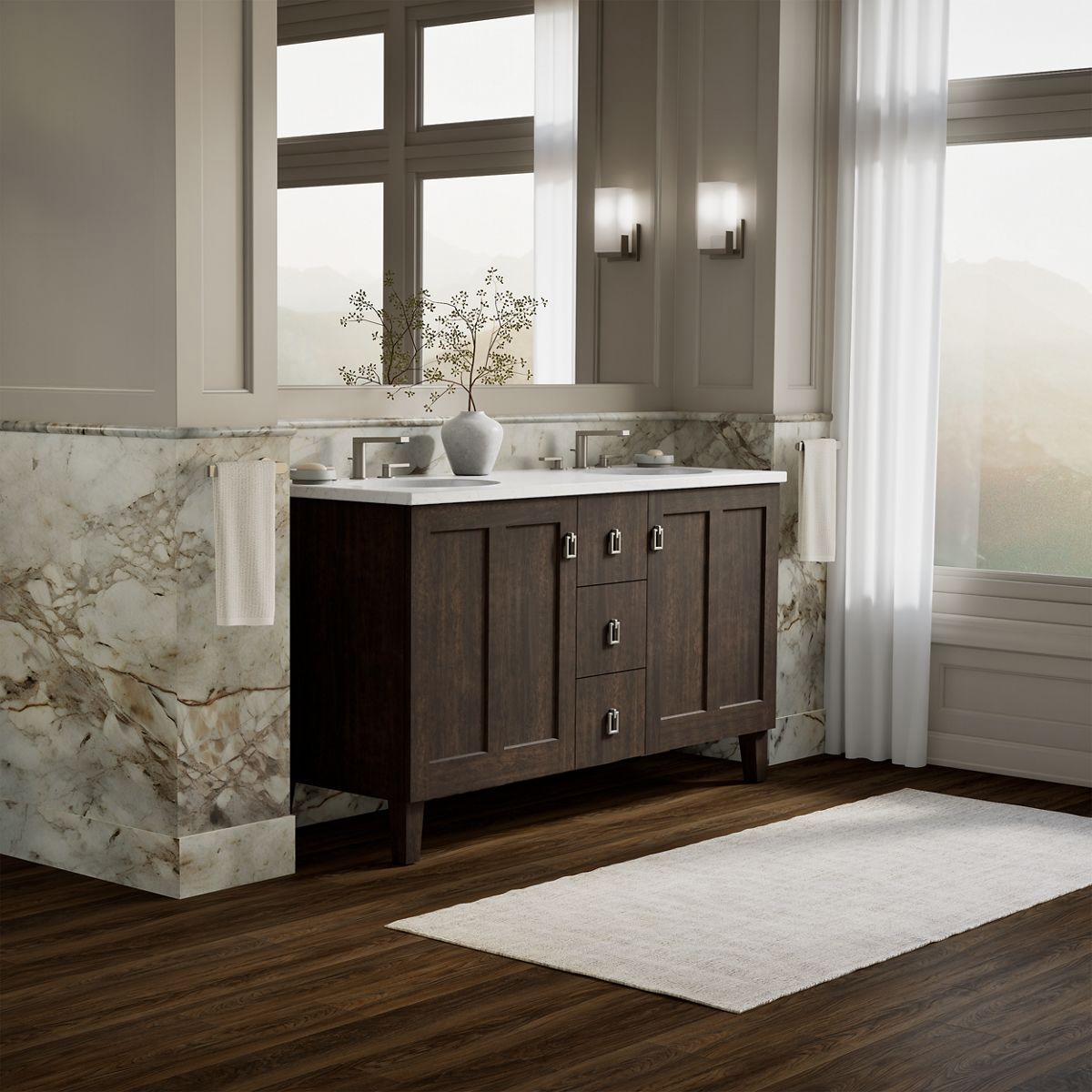 Breathtaking design meets unrivaled craftsmanship. No detail was overlooked in the meticulous crafting of this collection, from the premium hardwoods to the specially designed hardware and vanity tops, all available in an array of finishes to create your own look. This Poplin vanity cabinet draws its inspiration from Craftsman and Shaker furniture designs and features a prominent wood grain for a robust, rustic feel. Complete your vanity with a coordinating top, hardware, and accessories from the collection.