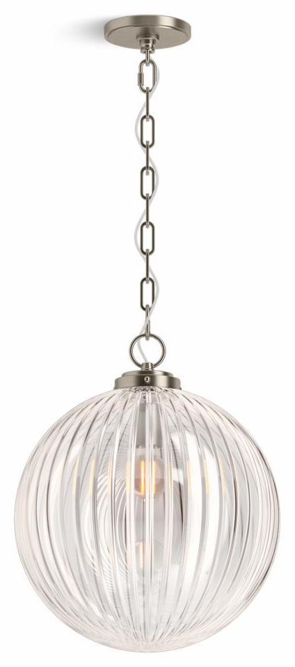 - Globular glass shade extends from decorative chain in an elegant transitional design suited for any room