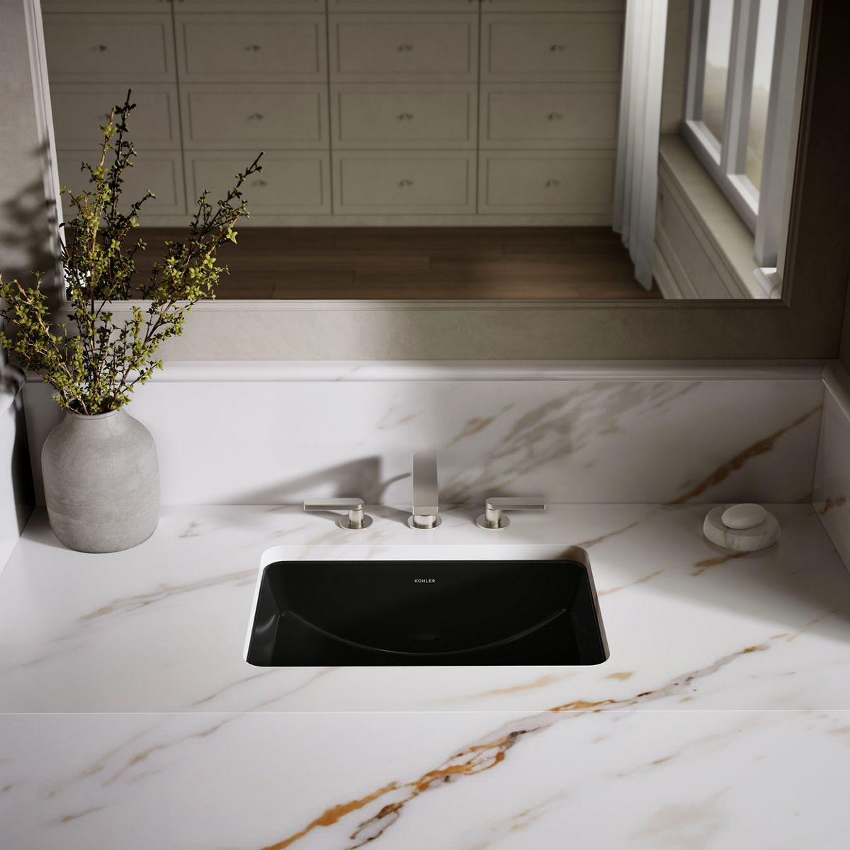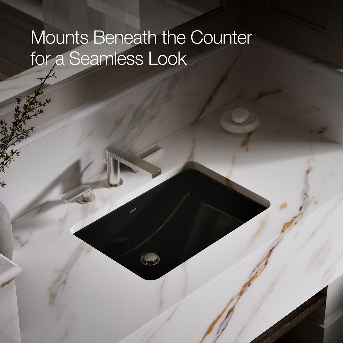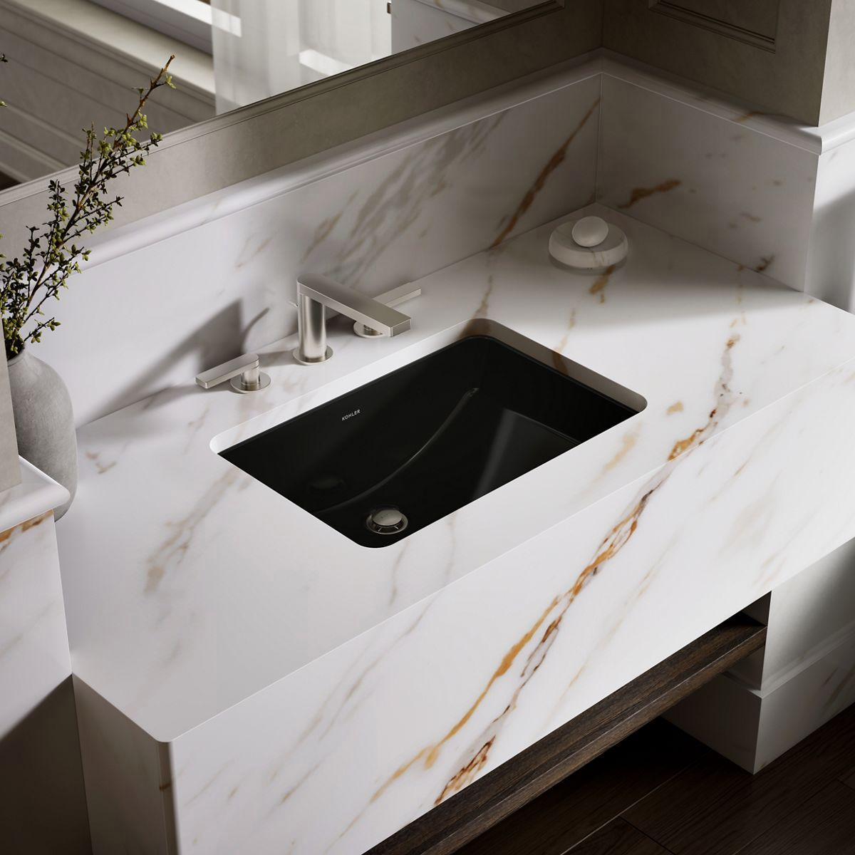 Ladena's upswept curves offer generous basin space and a striking contemporary look, particularly when paired with a countertop that exposes the basin's glazed underside.
