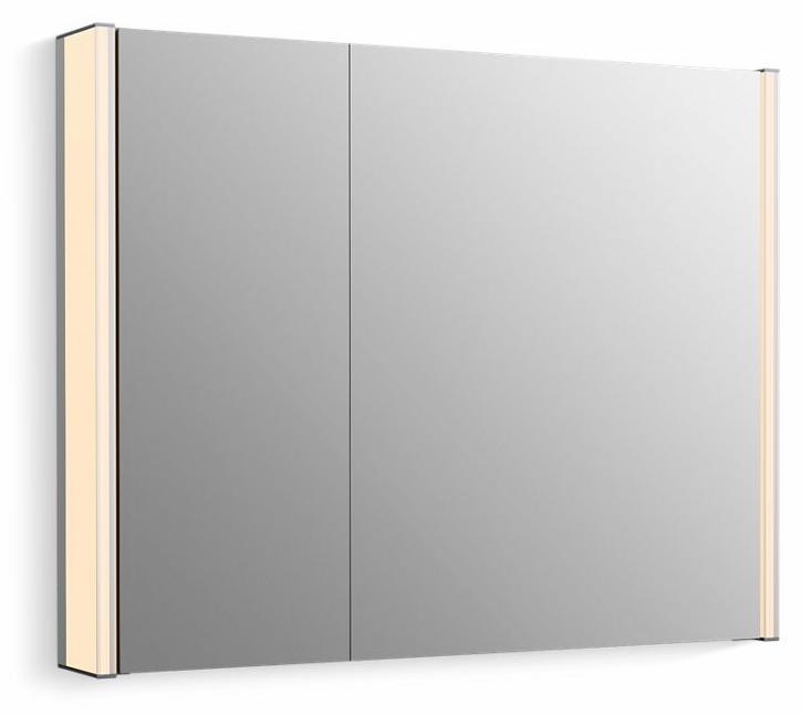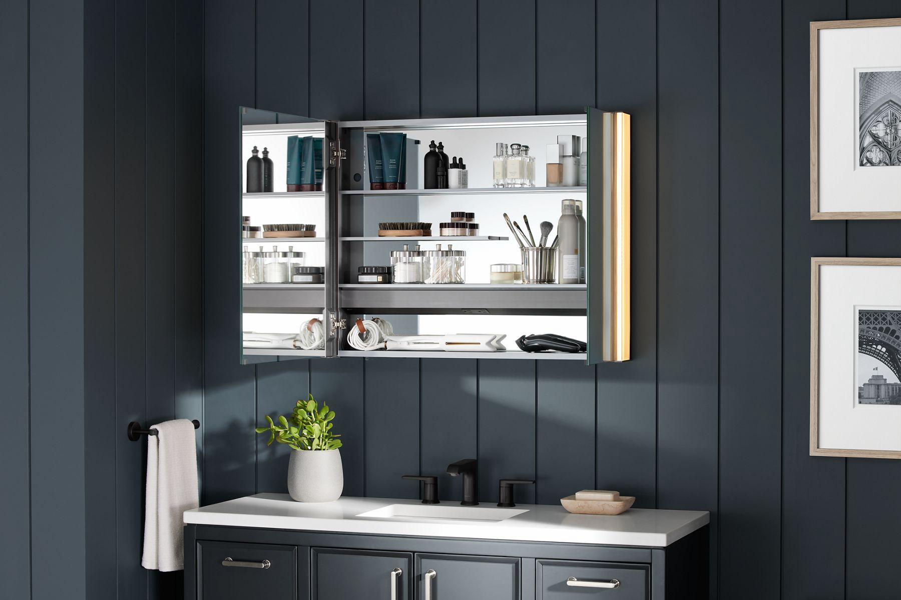 Innovate your vanity space and maximize your bathroom style and storage with the Maxstow 32 W x 24 H lighted medicine cabinet, featuring exterior LED lighting, an interior electrical outlet, and the ability to attach a coordinating Moxie speaker charging dock (sold separately). Staggered shelving holds tall and short items with no wasted space, while interior-door and back-panel mirrors provide reflection whether the doors is open or closed. The slim 3½-deep design provides the same internal storage space as traditional 5-deep cabinets. Installation is fast and easy right out of the box—simply screw to the wall.