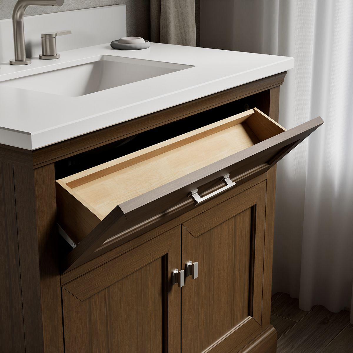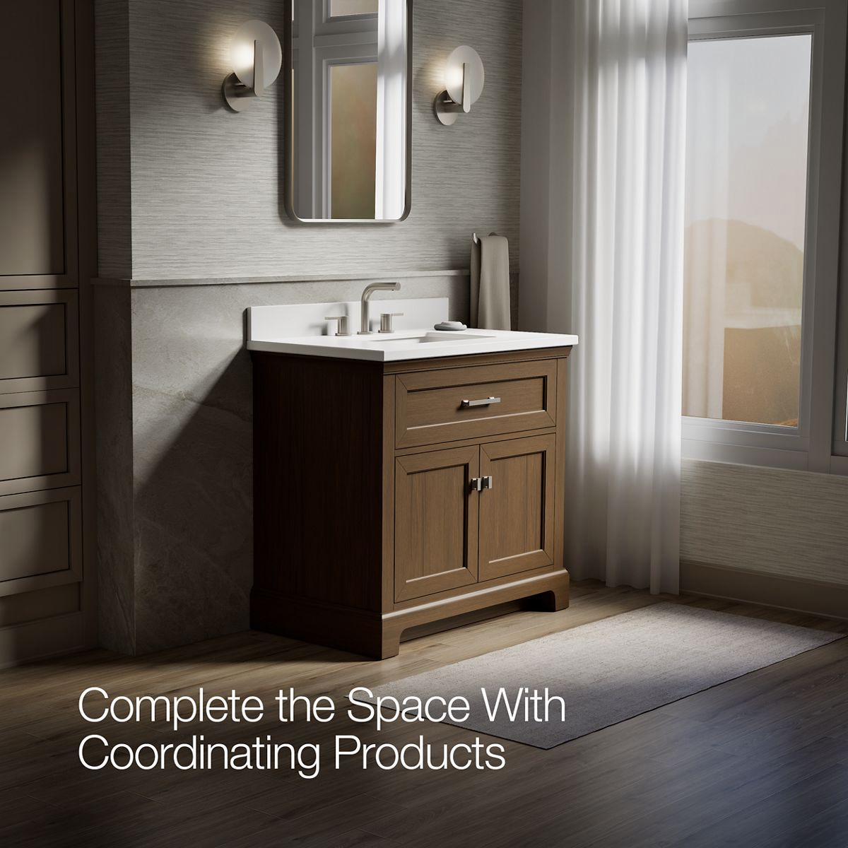 Inspired by midcentury modern design, the KOHLER® Charlemont vanity collection is adorned with elegant lines, subtle textures, and minimalist simplicity, bridging the gap between commonplace and niche. Raised-center door and drawer panels add visual interest, along with sharply squared hardware pulls featuring subtle details. This 36" freestanding single sink vanity set includes cabinet, quartz countertop with matching backsplash, sink, and hardware.