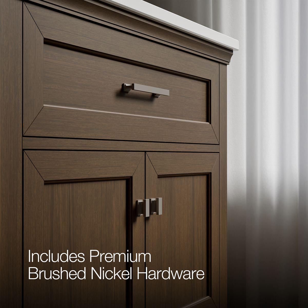 • Vibrant® Brushed Nickel hardware included on White vanities, Vibrant Brushed Moderne Brass hardware on Ferrous Grey and Tidal Blue vanities, and Matte Black hardware on Light Oak vanities