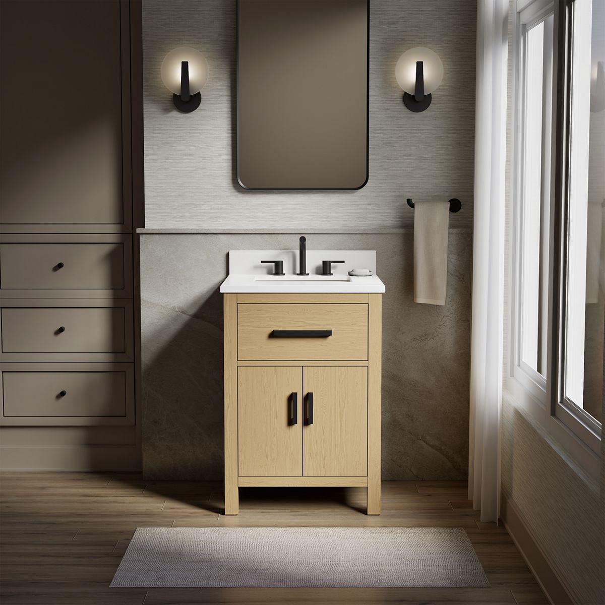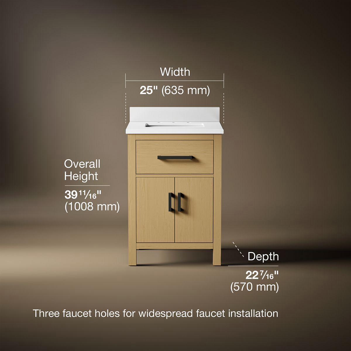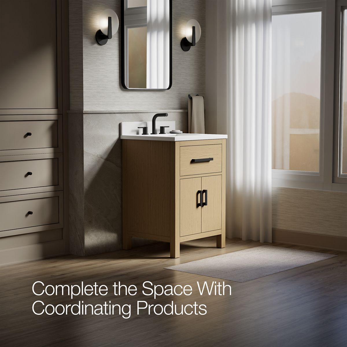 The Kresla vanity collection brings a quiet sophistication into your bathroom space with its with clean, architectural lines and range of finishes, and with its roomy interior you'll find ample storage space to keep your bathroom organized and clutter-free. The Kresla 24" vanity set includes cabinet, quartz countertop with matching backsplash, sink, and hardware. With KOHLER, it’s easy to find the design solution that’s right for you.