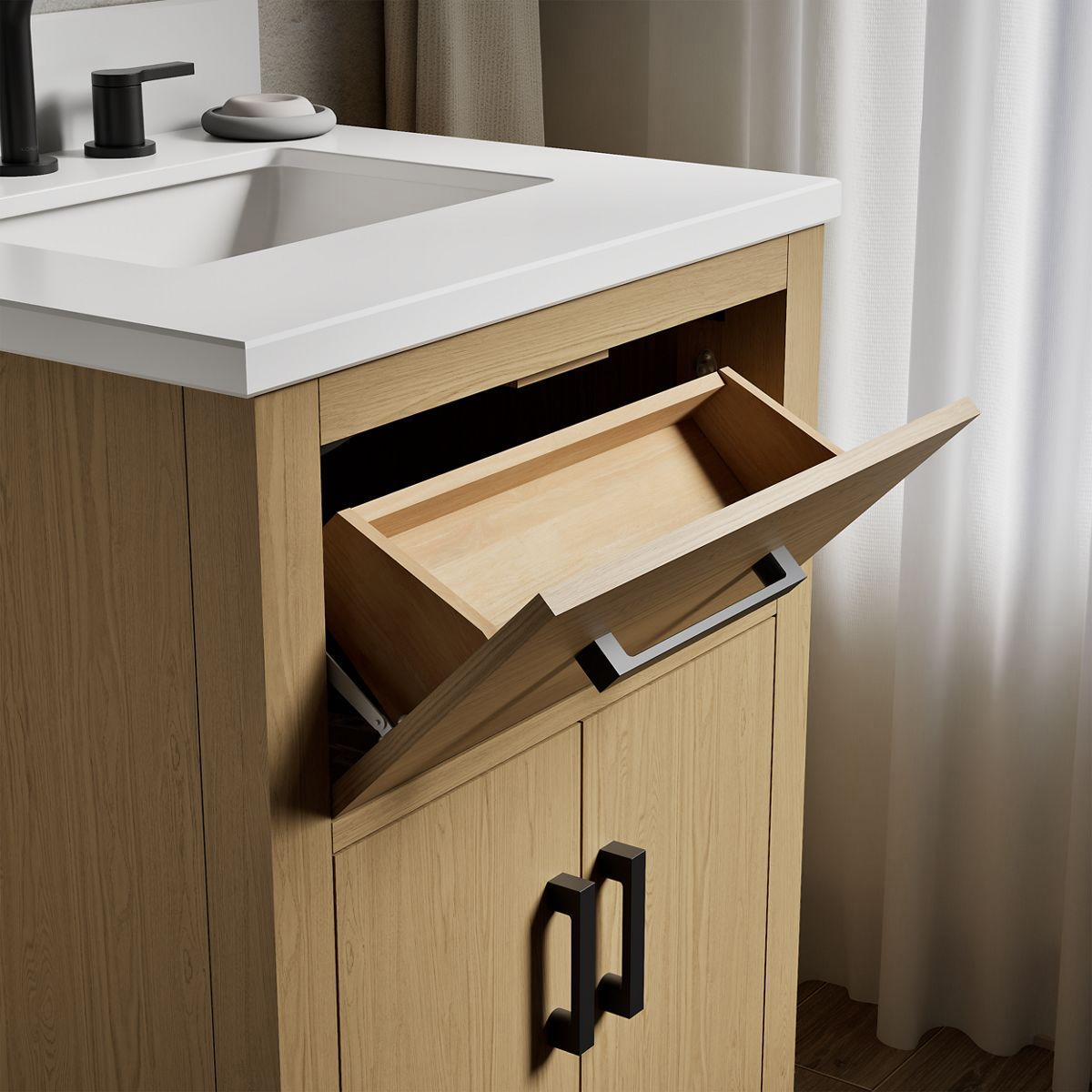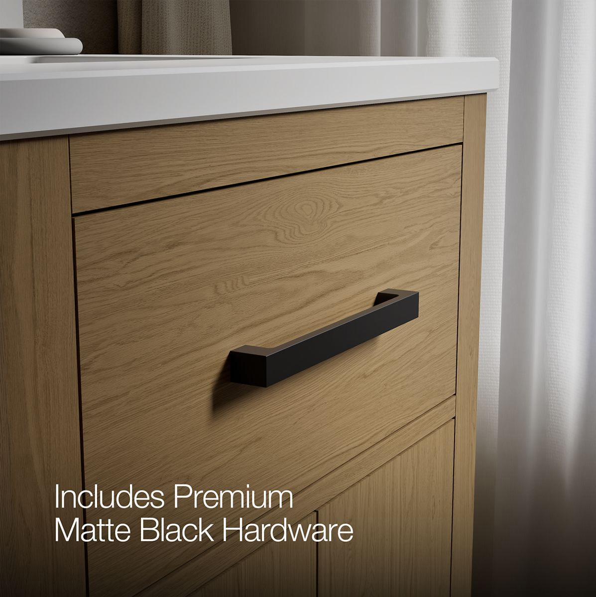 - Brushed Nickel hardware included on White, Atmos Grey, and Carbon Oak vanities, and Matte Black hardware on Light Oak vanities.