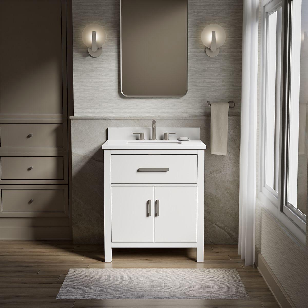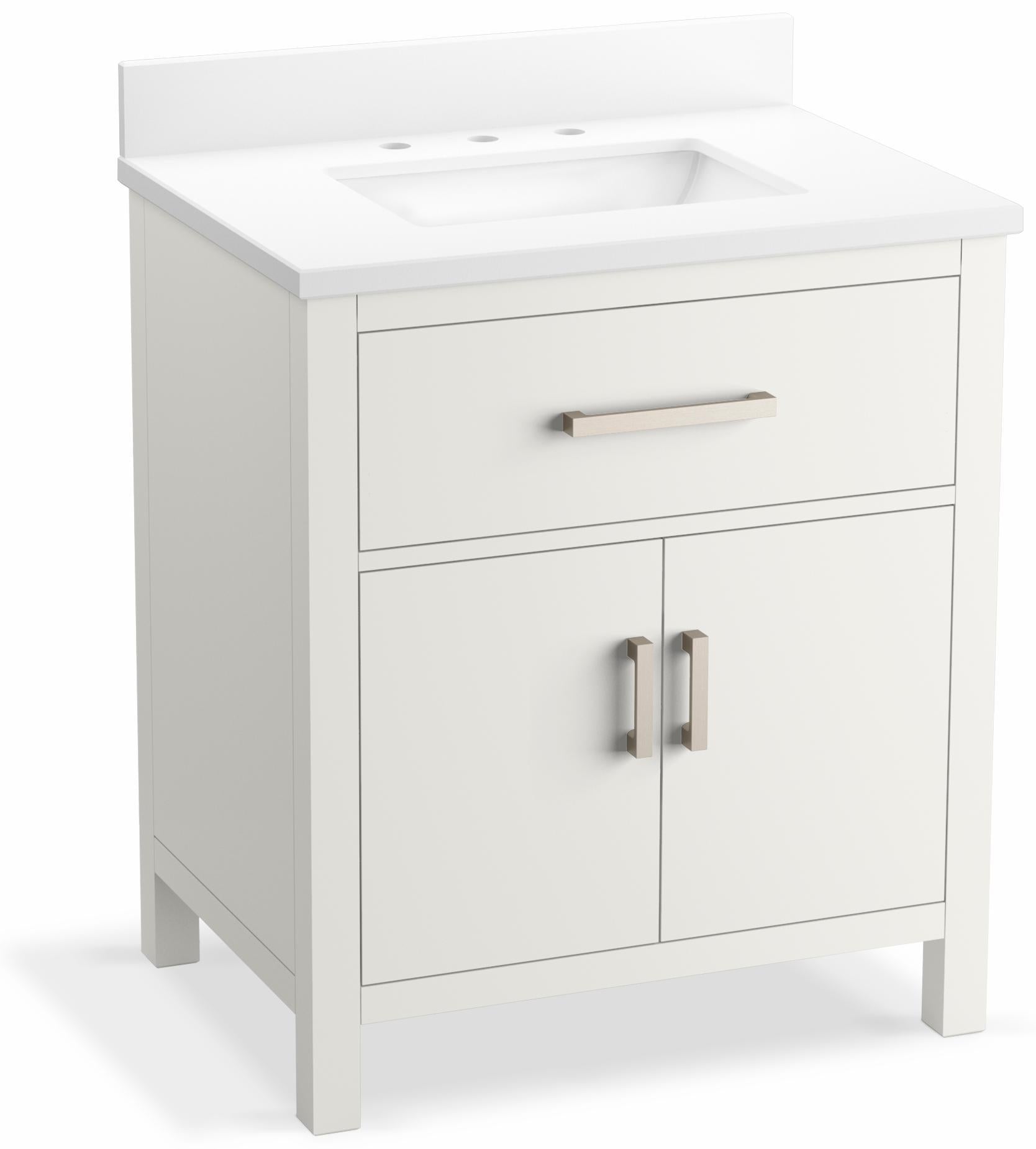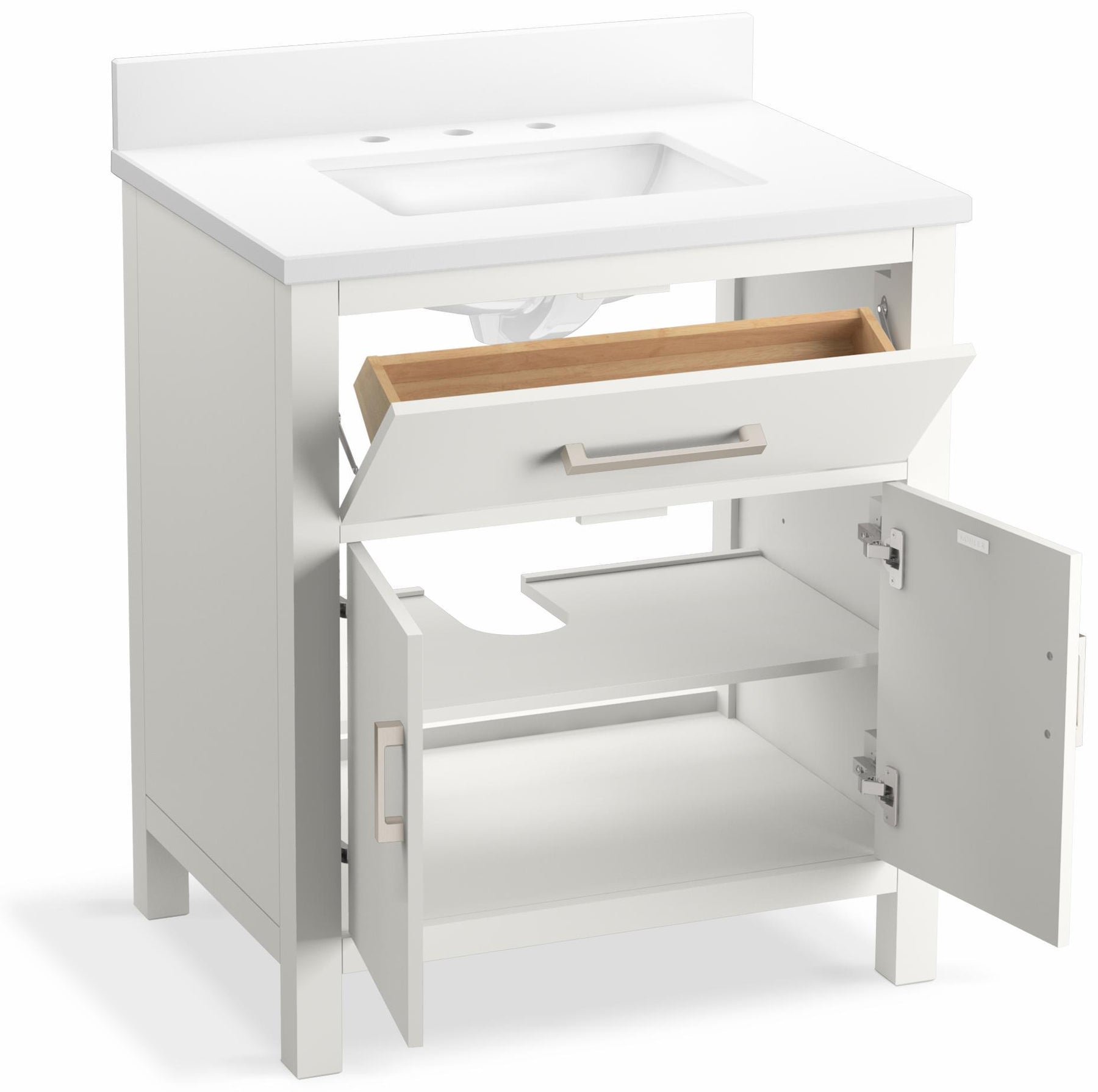 The Kresla vanity collection brings a quiet sophistication into your bathroom space with its with clean, architectural lines and range of finishes, and with its roomy interior, you'll find ample storage space to keep your bathroom organized and clutter-free. The Kresla 30" vanity set includes cabinet, quartz countertop with matching backsplash, sink, and hardware. With KOHLER, it’s easy to find the design solution that’s right for you.