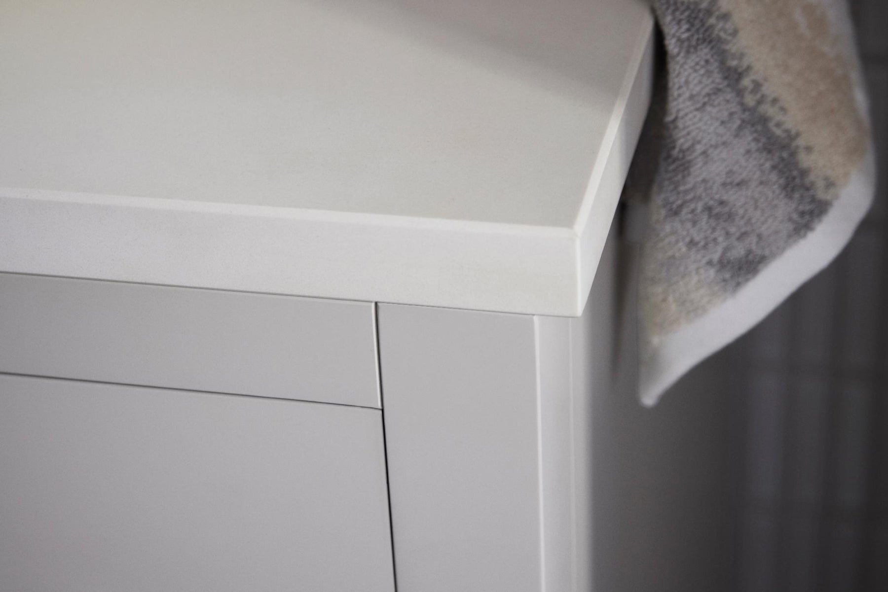 - White (GWT) quartz vanity top and backsplash add beauty and long-lasting durability