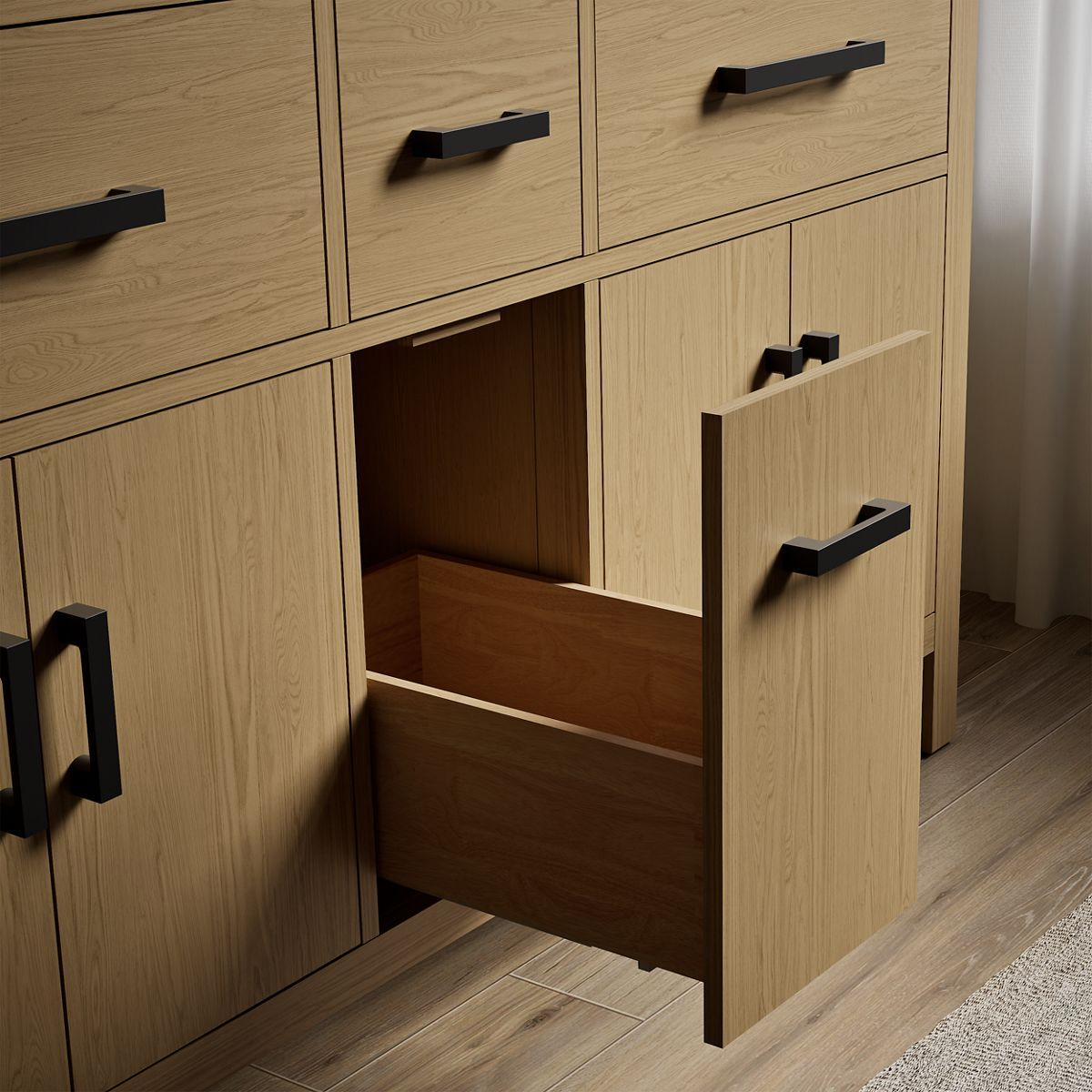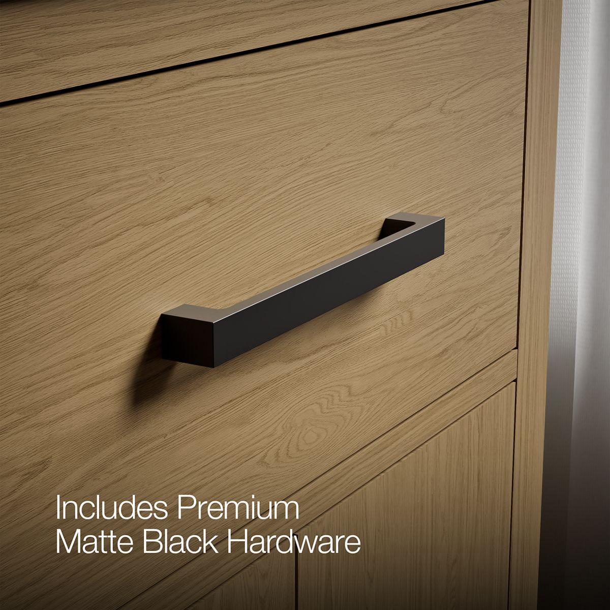 - Brushed Nickel hardware included on White, Atmos Grey, and Black Oak vanities, and Matte Black hardware on Light Oak vanities.