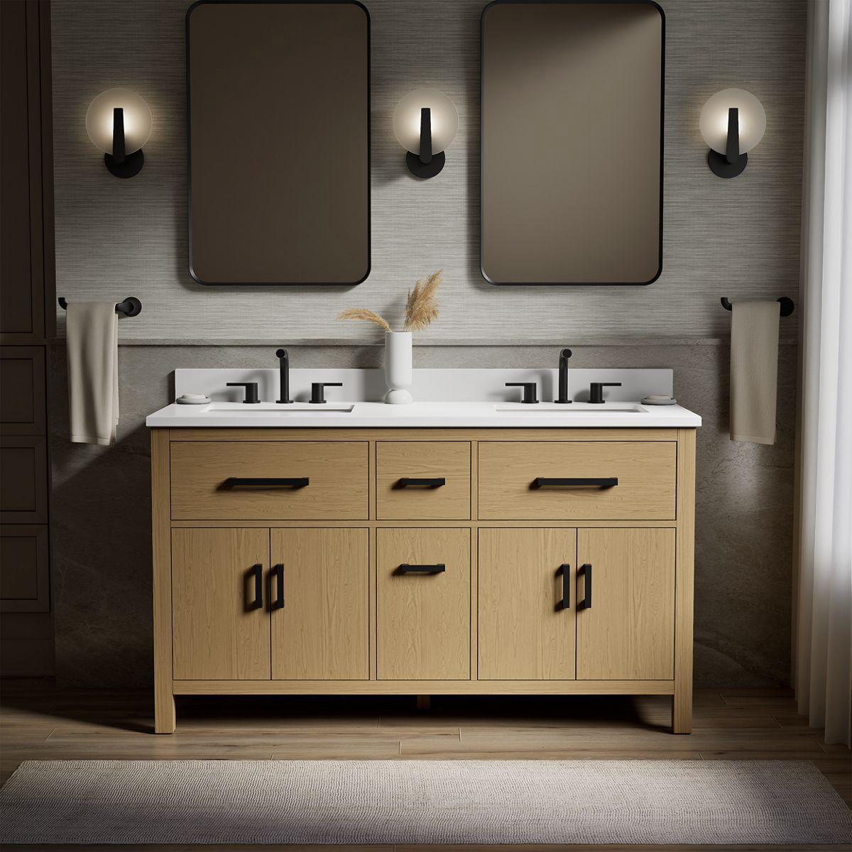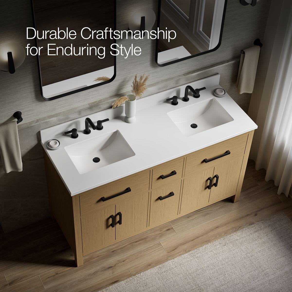 - Brushed Nickel hardware included on White, Atmos Grey, and Carbon Oak vanities, and Matte Black hardware on Light Oak vanities.