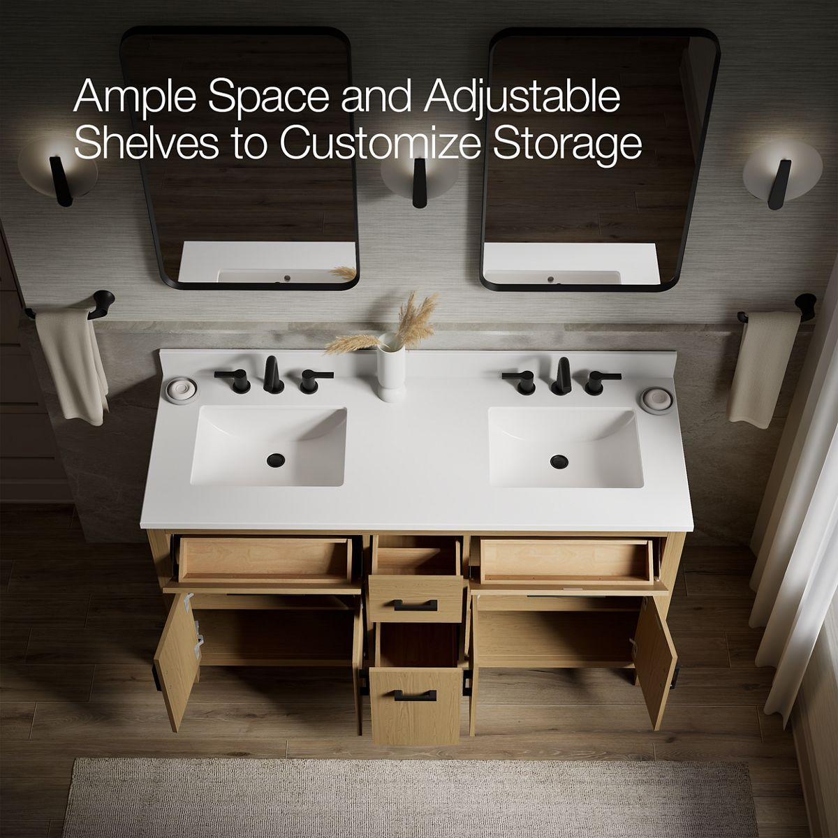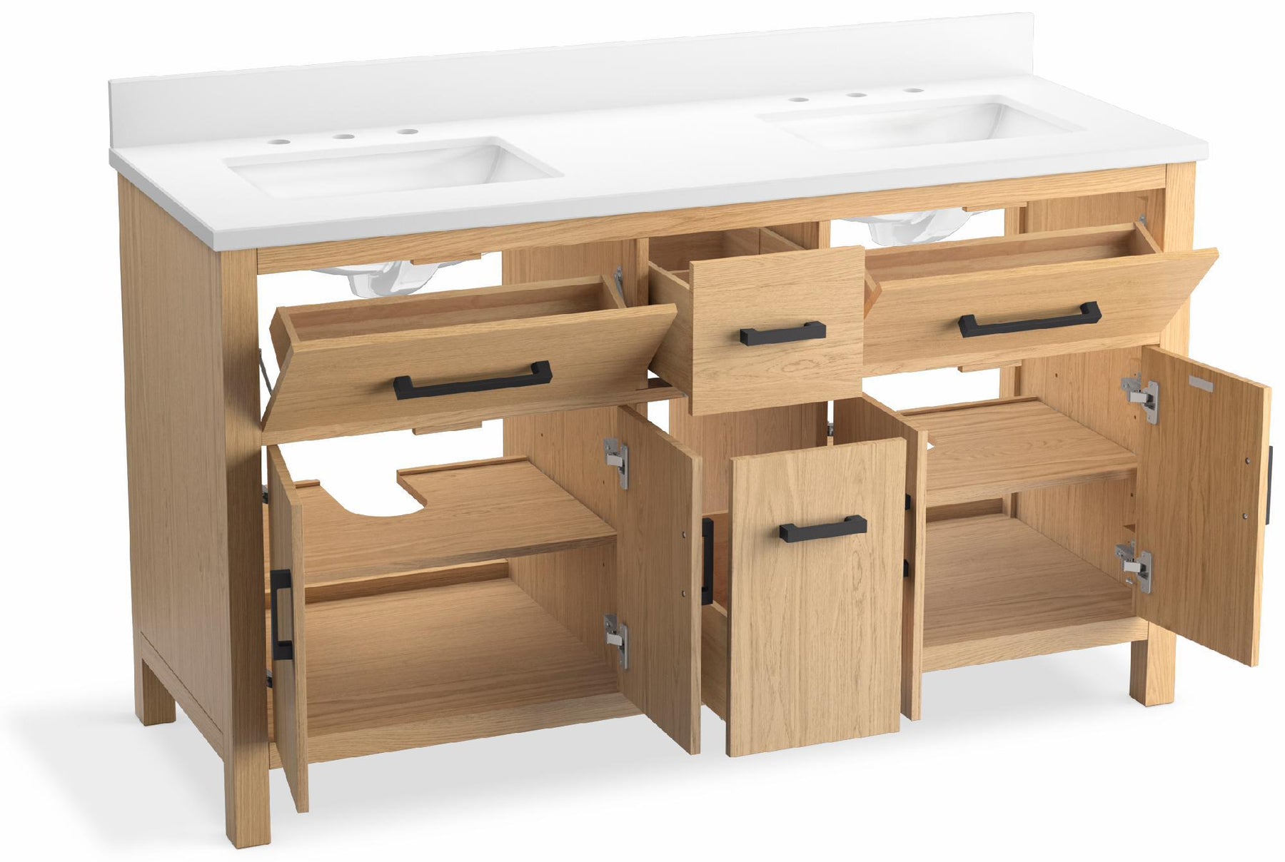 The Kresla vanity collection brings a quiet sophistication into your bathroom space with its with clean, architectural lines and range of finishes, and with its roomy interior, you'll find ample storage space to keep your bathroom organized and clutter-free. The Kresla 60" vanity set includes cabinet, quartz countertop with matching backsplash, two sinks, and hardware. With KOHLER, it’s easy to find the design solution that’s right for you.