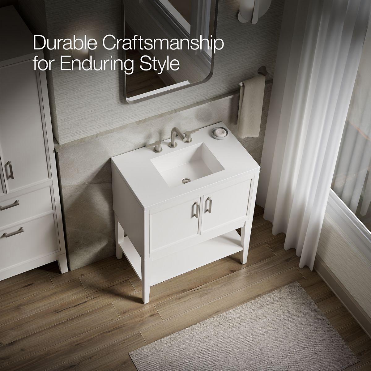 - Pure White (PWH) quartz vanity top adds beauty and long-lasting durability