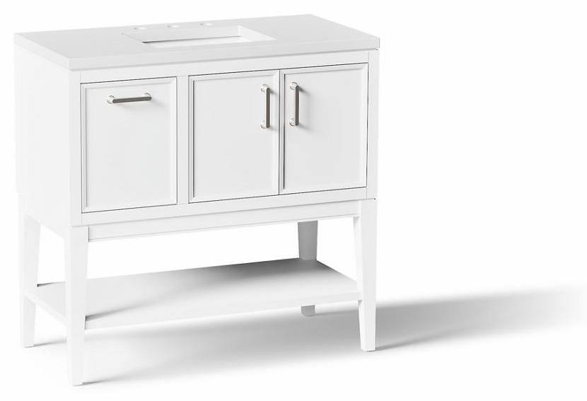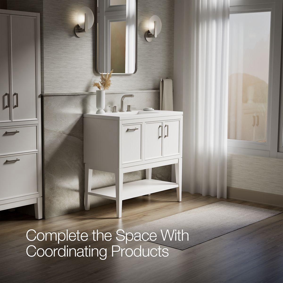 Timeless, simplistic pieces updated for the modern home, Winnow bathroom cabinets are at once familiar and different. Optional tall, tapered legs and symmetrical design are recognizably Shaker, while beveled door and drawer fronts and hardware with rounded corners deliver fresh details. The perfect balance of classic, elegant, and versatile, Winnow vanities come to life when you select your cabinet color. Cabinet, countertop, sink, legs, shelf, and Vibrant Brushed Nickel hardware are included with the set, which is ready for self-assembly on legs or wall. Additional hardware finishes are also available.
