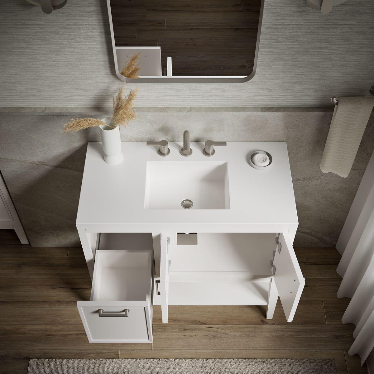 - Pure White (PWH) quartz vanity top adds beauty and long-lasting durability