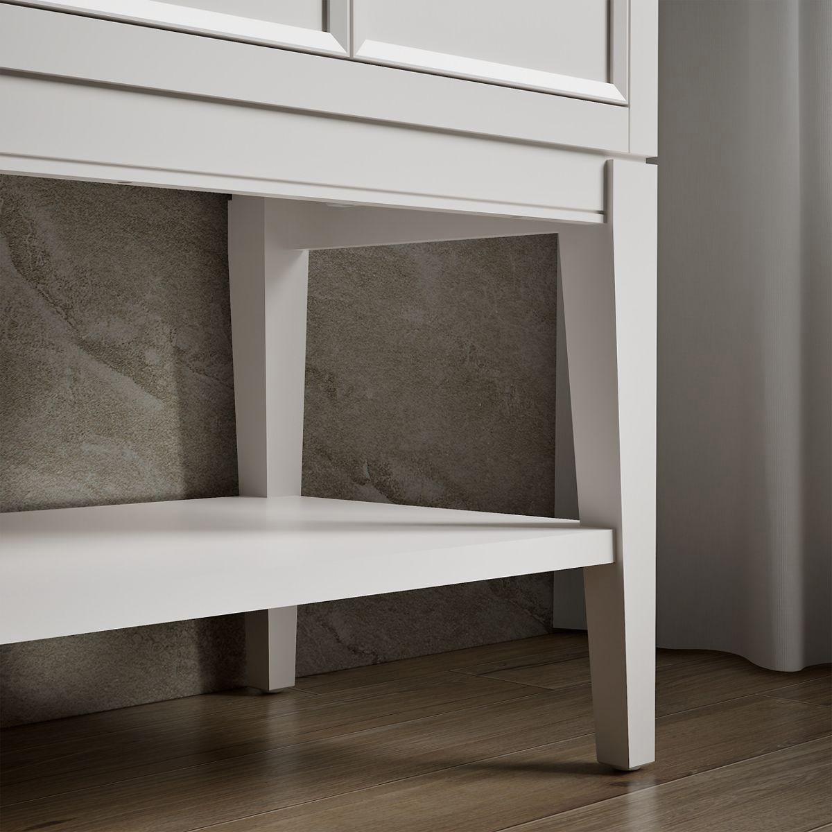 - Set includes cabinet, precut quartz vanity top, sink, optional tall legs and shelf, and cabinet hardware.
