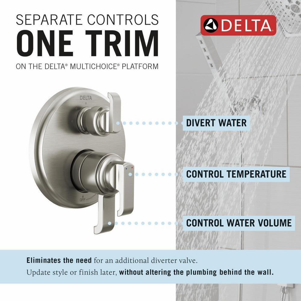 Familiar geometries and subtle curves in the Tetra Bath Collection combine to bring a sleek, architectural look and feel to the bath. Delta showers with Monitor pressure-balance valves are engineered to make sure you don't experience a sudden and possibly unsafe change in water temperature as a result of running water elsewhere, such as using a dishwasher, flushing a toilet or running a washing machine. Lumicoat Finishes are guaranteed to resist water spots and mineral buildup and easily wipe clean without the need for cleaners or chemicals. The ultra-sleek surface repels liquids, resisting water spots and staying cleaner longer, so your faucet’s most commonly touched areas stay beautiful. Integrating separate controls on one trim with the MultiChoice Integrated Shower Diverter allows you to simply set the water at your preferred temperature and turn the shower on or off with the volume control handle - without interrupting your set temperature. You can install with confidence, knowing Delta products are backed by our Lifetime Limited Warranty.