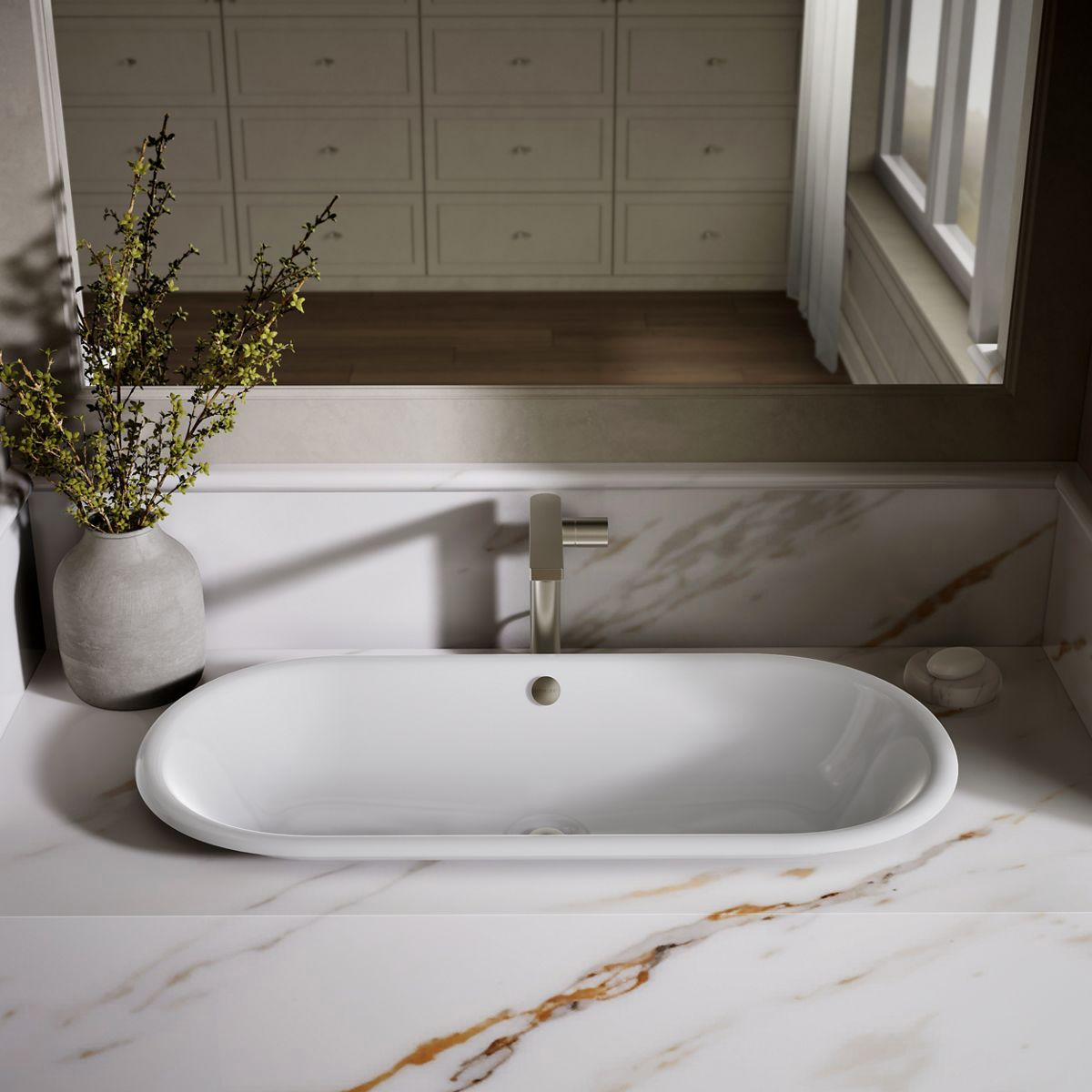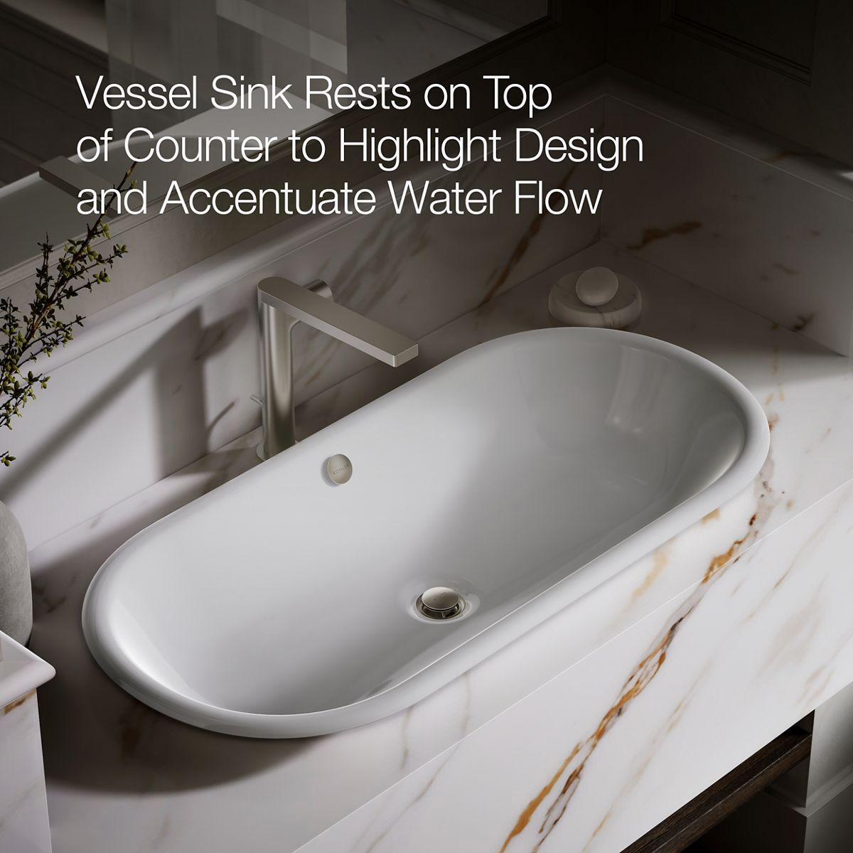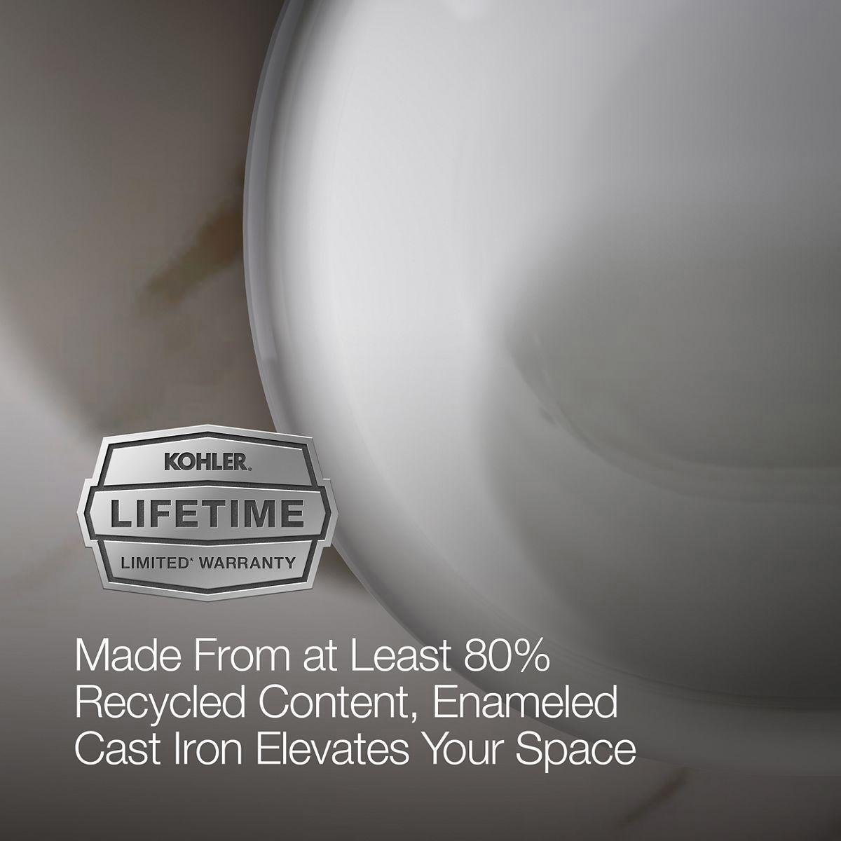 With its gently curved, organic shape, the Iron Plains sink combines distinctive style with the extreme durability, strength, and vintage soul of KOHLER enameled cast iron. This capsule-shaped bathroom sink has a painted underside, which allows for a striking vessel installation as well as drop-in or under-mount installation.