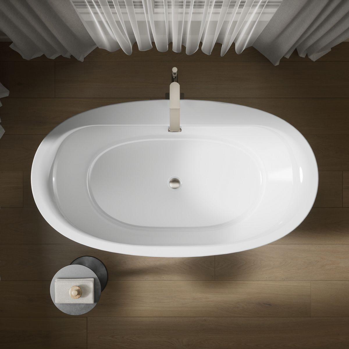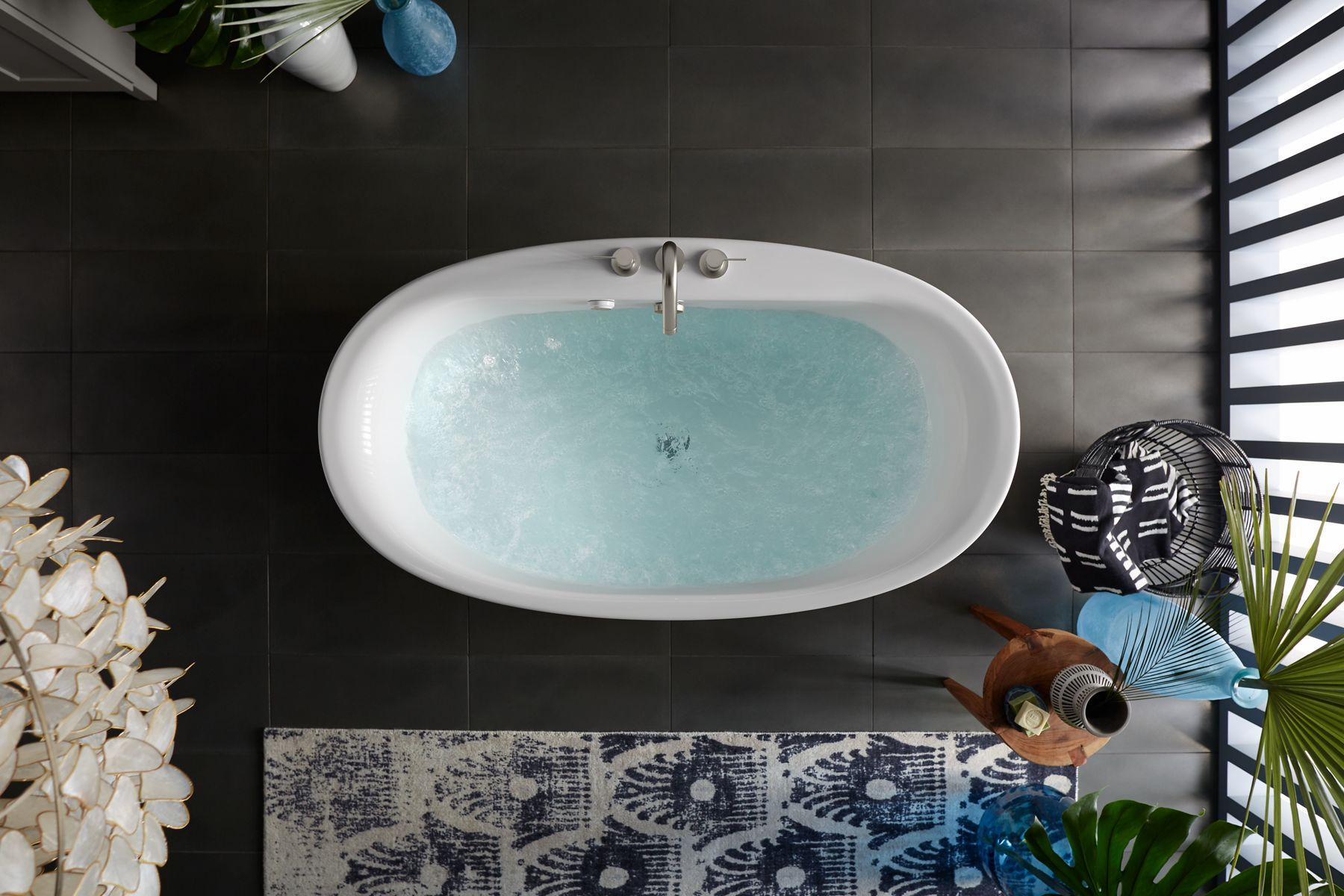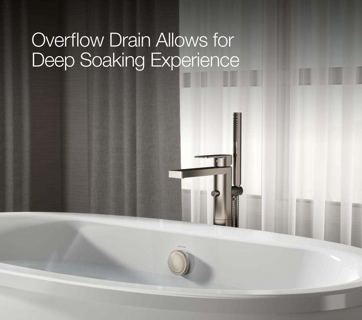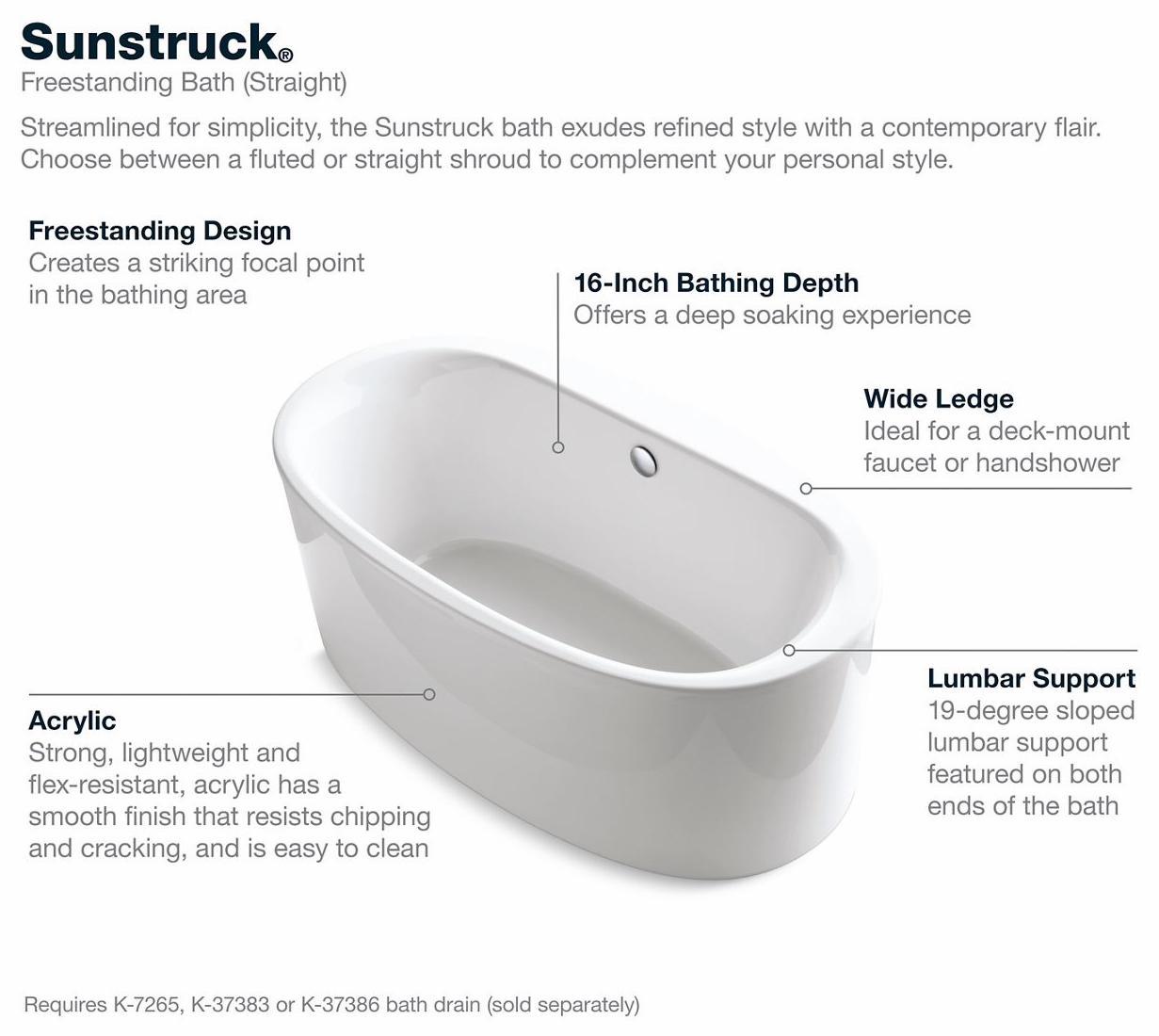 Surround yourself with tranquility and comfort in the Sunstruck freestanding bath. Combining luxury with practicality, the oval, ergonomic design conforms to and supports your body as you stretch out and enjoy a deep, relaxing soak. With its gracefully shaped lines and straight shroud, this versatile bath complements a wide range of bathroom styles and offers easy three-step installation.