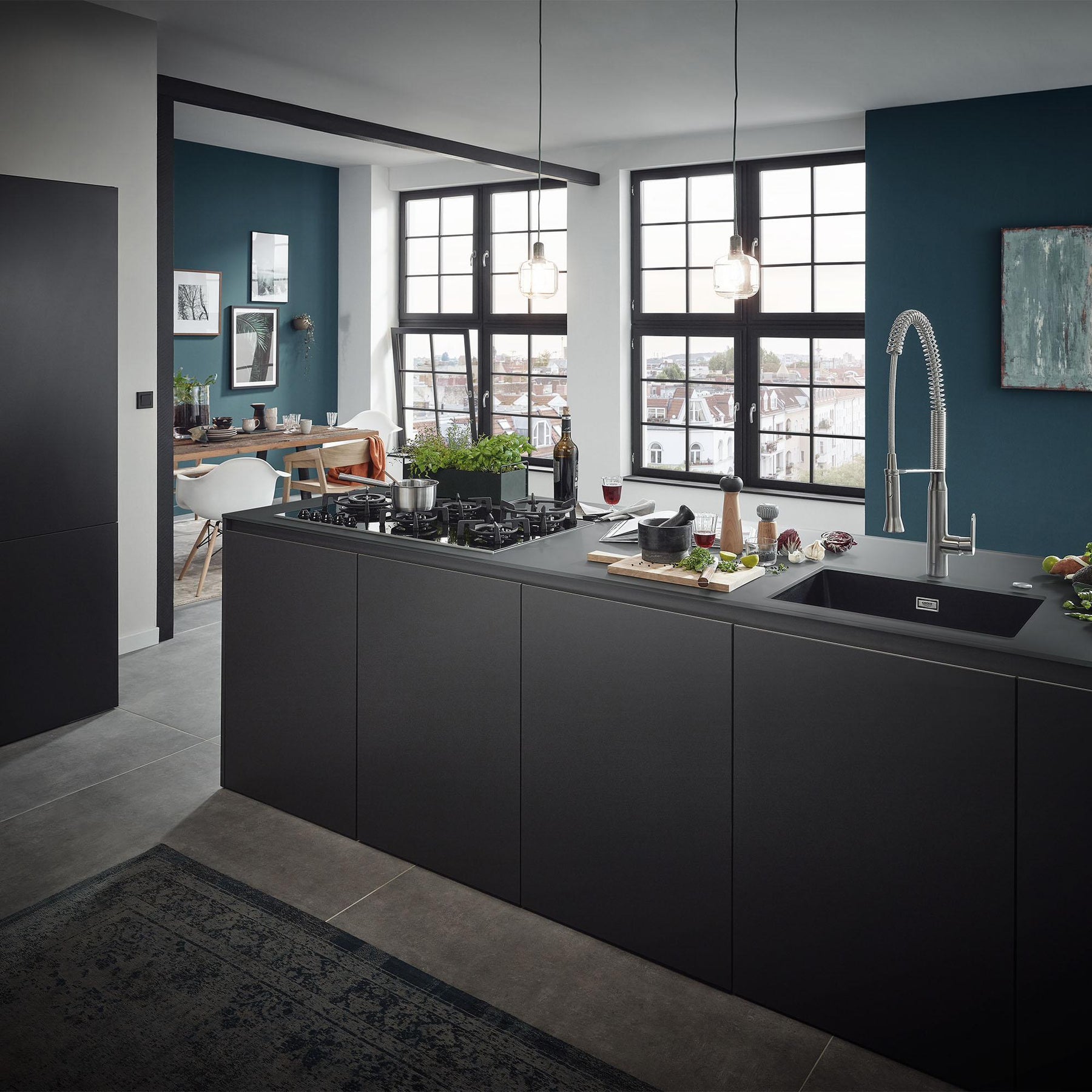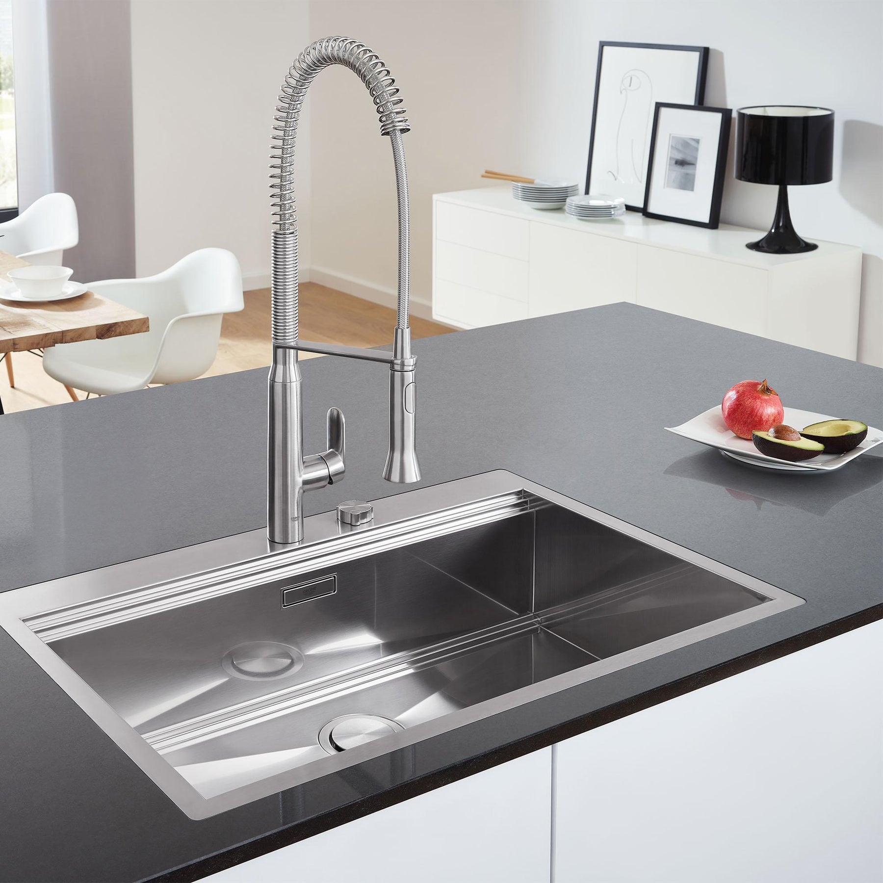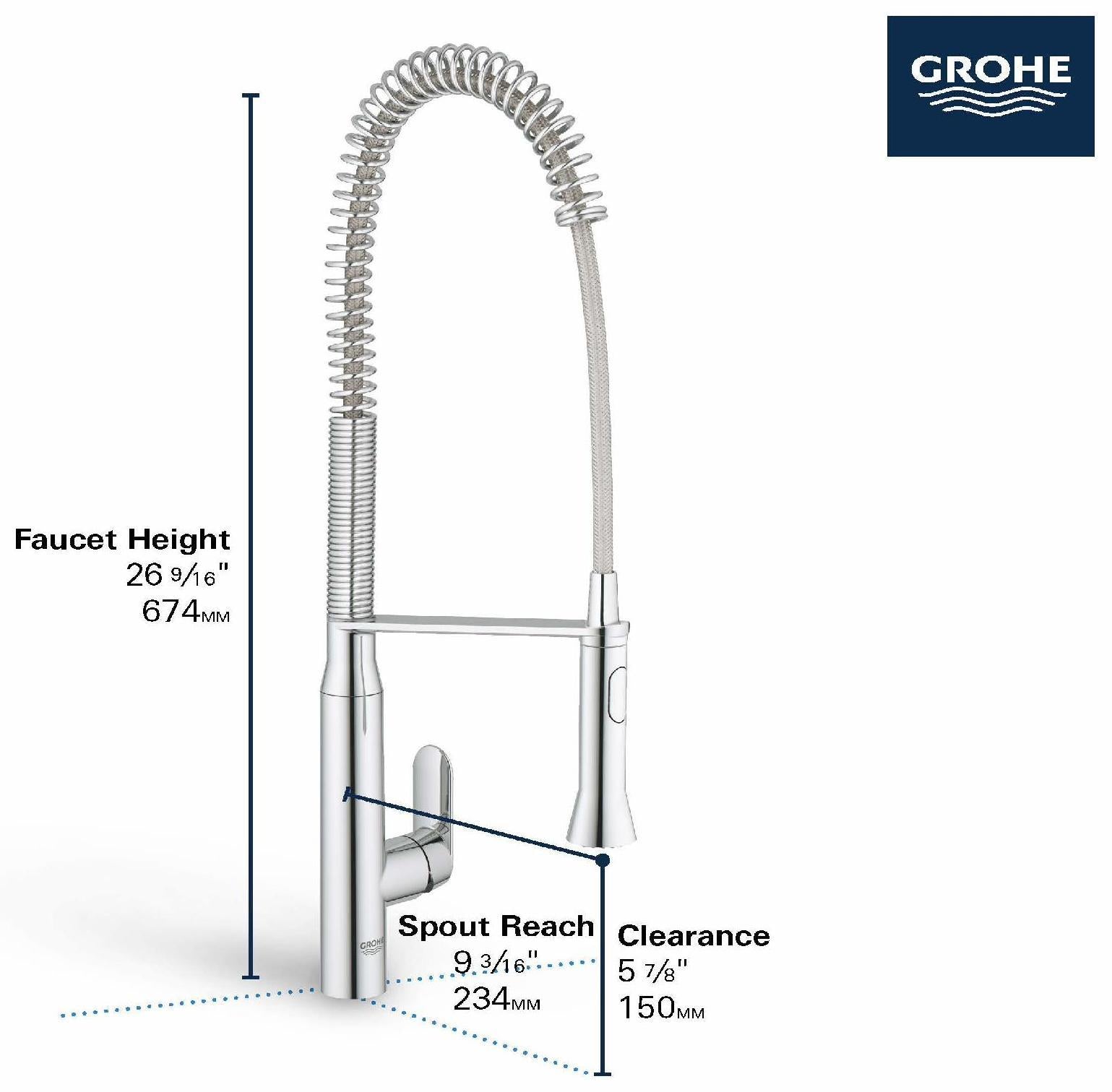 Designed to make a statement, the K7 Single-Handle Semi-Pro Dual Spray Kitchen Faucet from GROHE is durable, dependable, and features a high spout to give your kitchen a true professional look. Spring arm provides an extensive operating radius within the sink and swivels 360-degree for added versatility in a center island. High spout and dual spray functions make every kitchen task easier, from filling pots to cleaning the sink and rinsing vegetables.