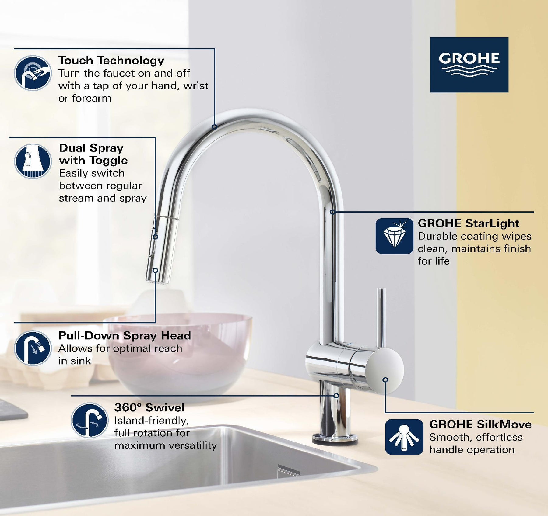 - PULL-DOWN DUAL-SPRAY FAUCET: Delivers smooth, even laminar flow and spray functions, hallmarks of GROHE engineering
