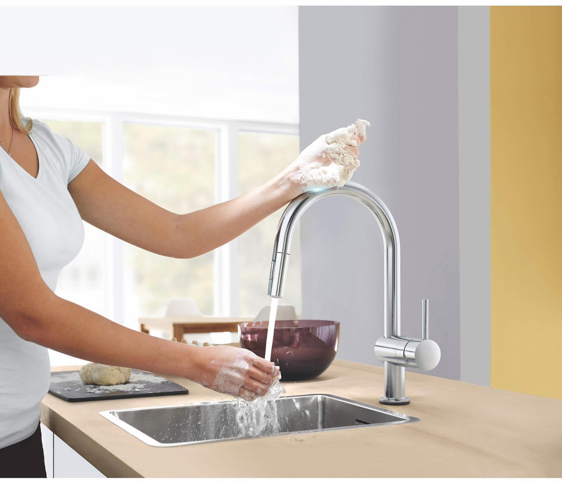 The sleek, sophisticated GROHE Minta Touch Dual-Spray Pull-Down Kitchen Faucet is a single-handle faucet that offers the convenience of touch activation. Simply touch the spout and the water turns on and off automatically, keeping it clean and hygienic no matter the task. With a convenient pull-down spray head featuring dual spray functions, you can easily toggle between regular stream and gentler spray for maximum versatility. Lever handle with GROHE SilkMove technology offers smooth and precise manual control of water pressure and temperature.