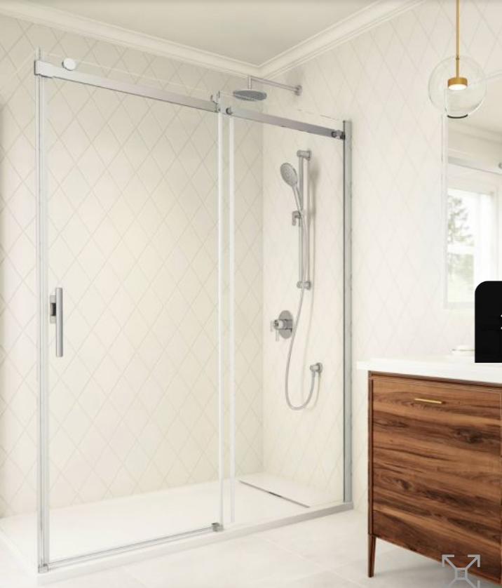 - Fixed panel in clear tempered glass of 10 mm (3/8”) and mobile panel in clear tempered glass of 8 mm (5/16”) with KaliaPROTEKTM protective film (outside panels) (KaliaPROTEKTM is a thin, transparent polyester protective membrane permanently bonded to the exterior of shower glass panels. It increases the strength of the glass and, in very rare cases of glass breakage, effectively traps glass shards agglomerated on the surface of the membrane to better protect users and their environment from property damage.)