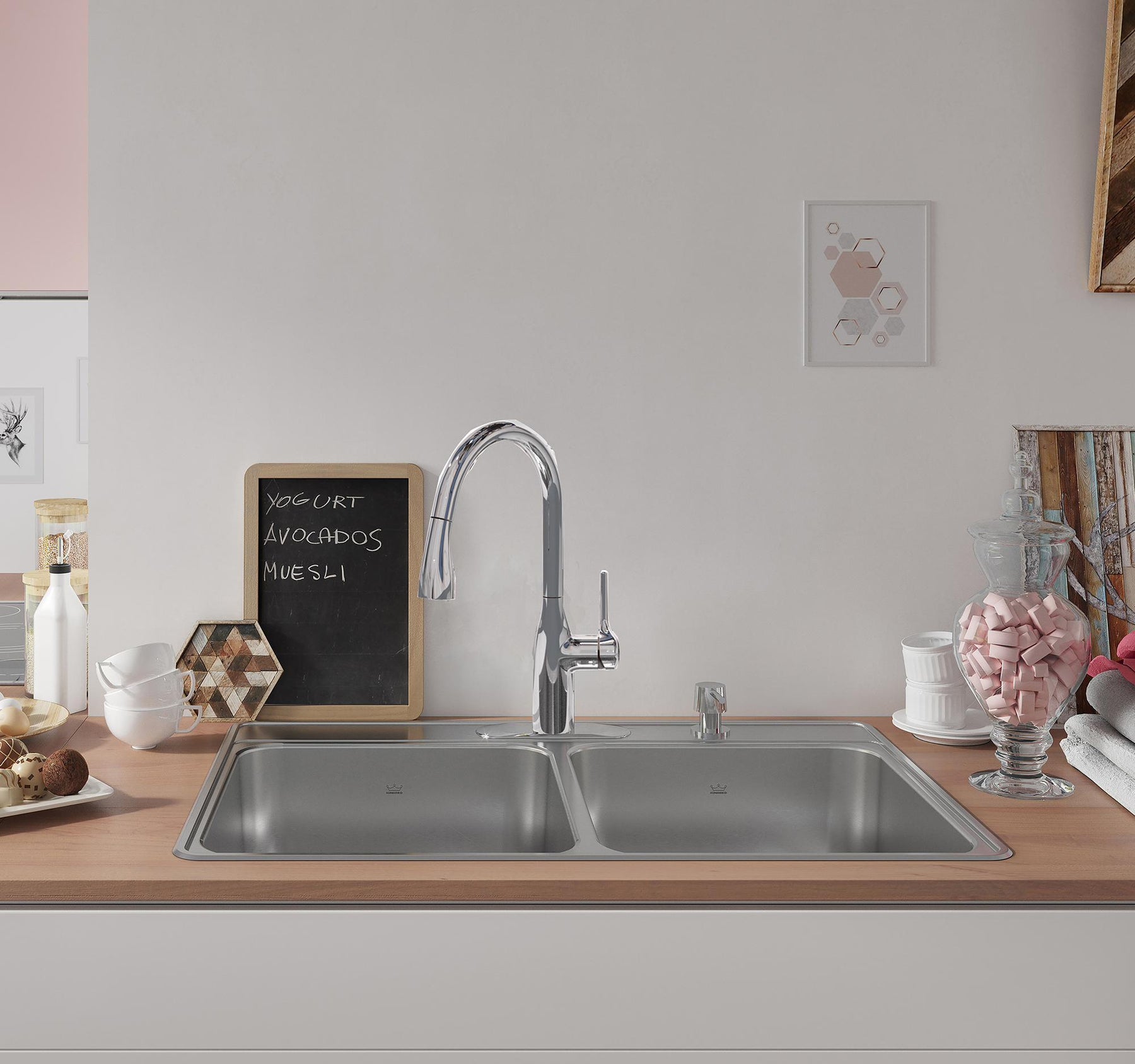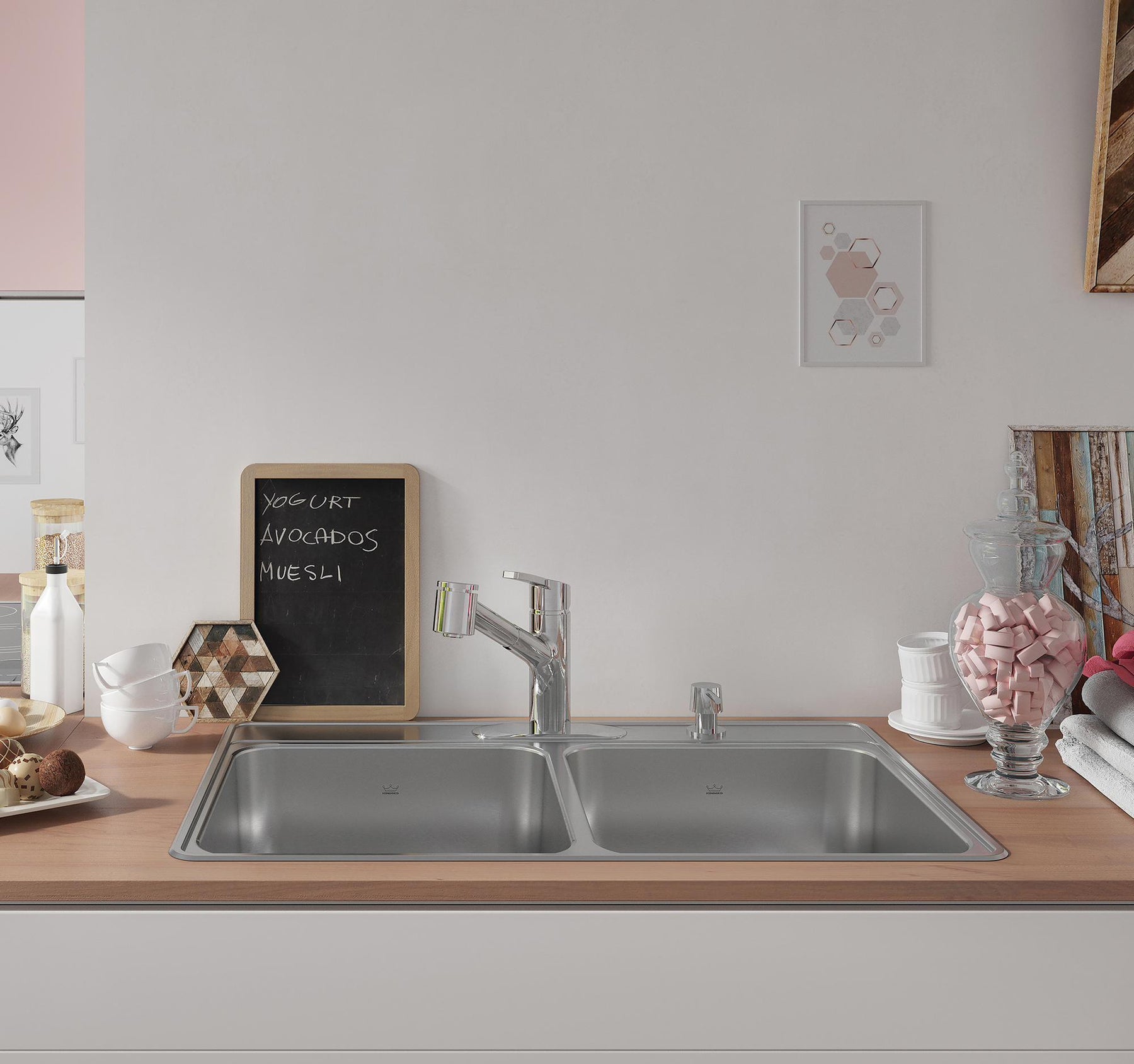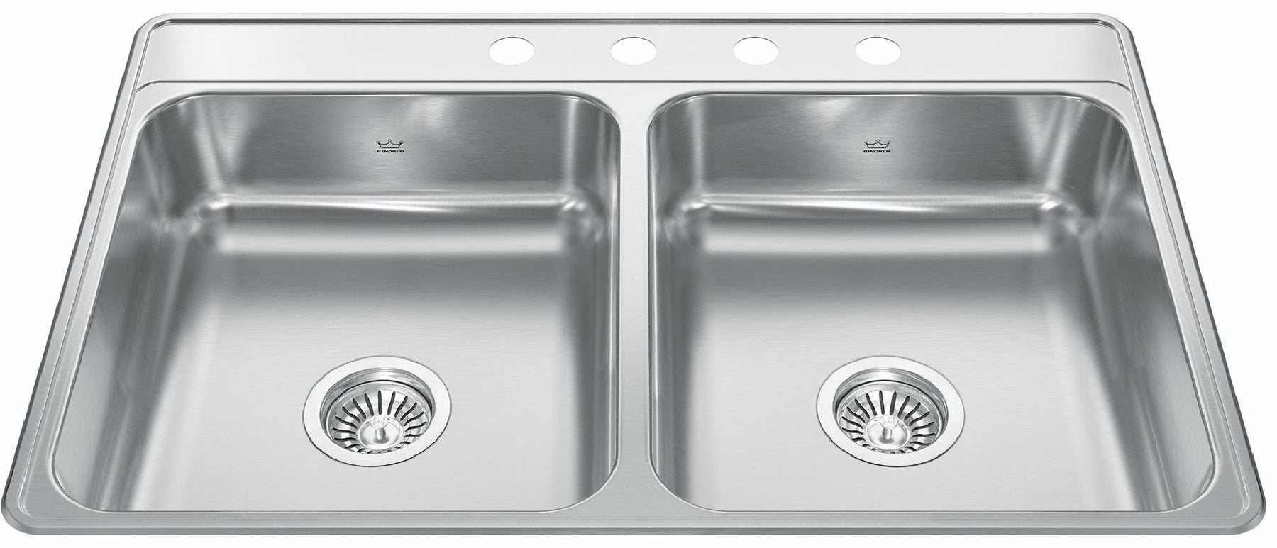 Creemore 33-in x 22-in Drop In Double Bowl 4-Hole Stainless Steel Kitchen Sink. Creemore Series sinks help make the daily grind less so, with a complete range of features. Creemore topmount sinks make even the busiest bowls a pleasure to use. Special pads reduce clanking and splashing noises so you can enjoy a quiet sink—even during bustling clean-up times of the day. Creemore sinks are built from sturdy 22 gauge steel, from the industry leader in stainless, with a finish that will stand up to everyday kitchen tasks. This sink is designed to drop into a pre-cut opening in the countertop and can be used with most countertop materials. A favorite for a quick kitchen upgrade
