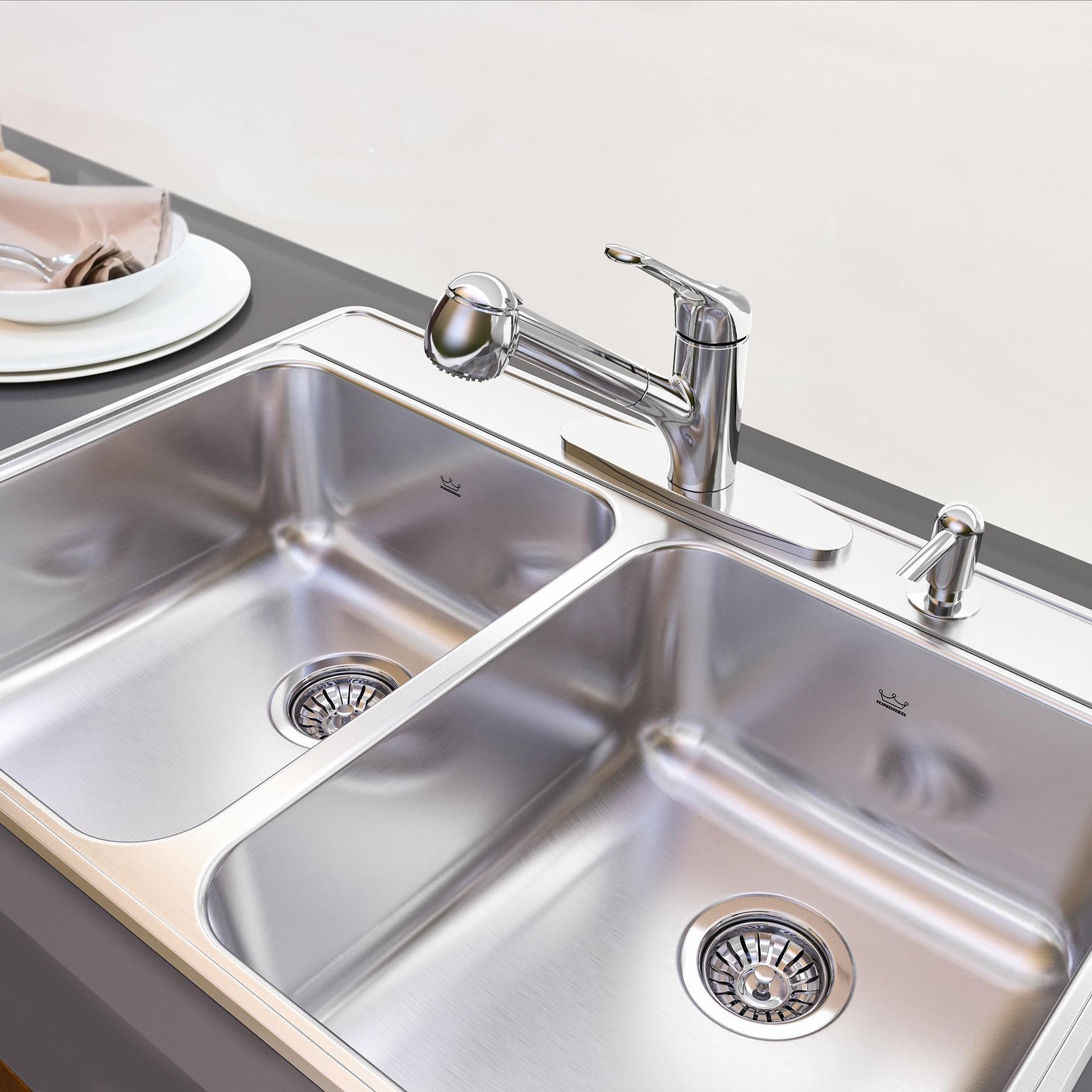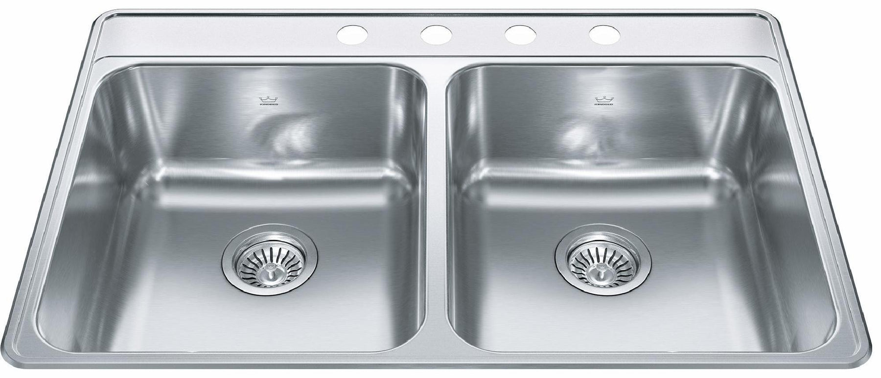 Creemore 33-in x 22-in Drop In Double Bowl 4-Hole Stainless Steel Kitchen Sink. Real life meets real simplicity with EZ Torque installation on these Creemore sinks. Our revolutionary installation system lets you drop and drill your sink into place, securely locking the sink to the countertop. Easier installation means enjoying your kitchen sooner. Made from sturdy 20-gauge stainless steel with a pore-free surface that does not harbor bacteria, it is naturally hygienic and easy to clean. Sound-reducing pads are placed at key points to help absorb the sounds from water splashing. The stylish and functional design joins impressively in transitional and contemporary kitchens.