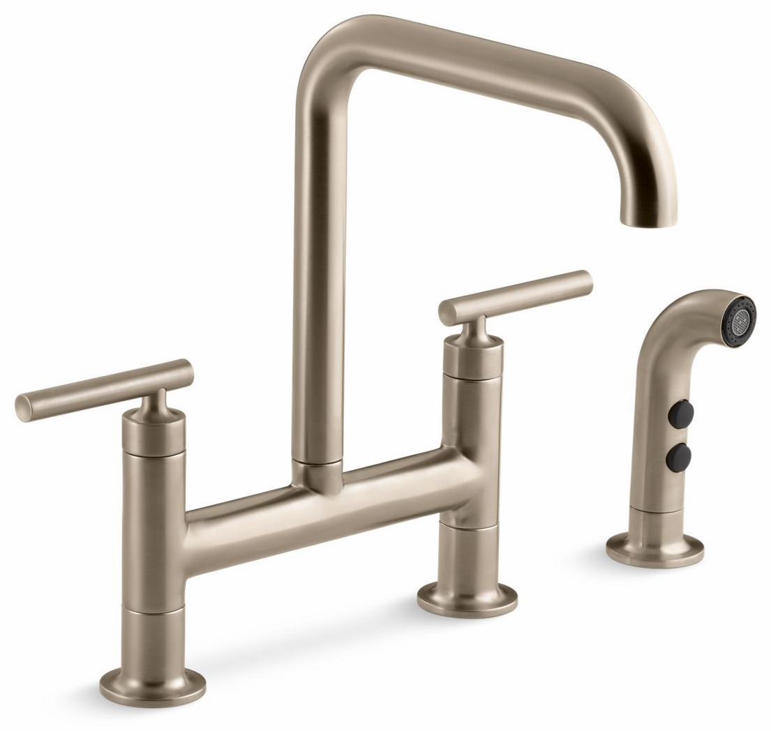 Pairing a classic bridge design with bold new touches, this Purist kitchen faucet combines distinctive modern style and easy-to-use features. The high-arch spout provides 10 inches of clearance and rotates 360 degrees, making way for your largest pots and pans. Extended lever handles offer plenty of grip area.