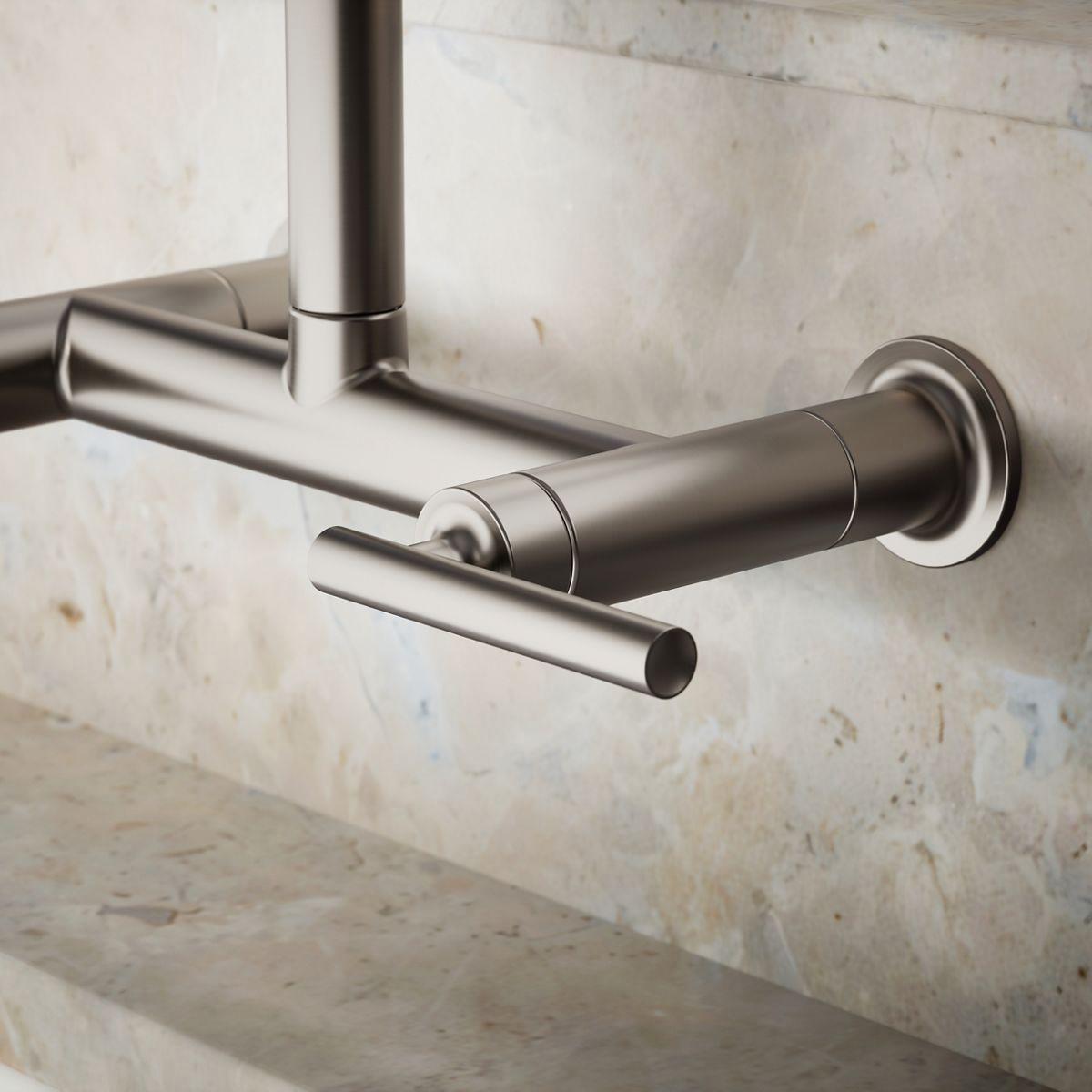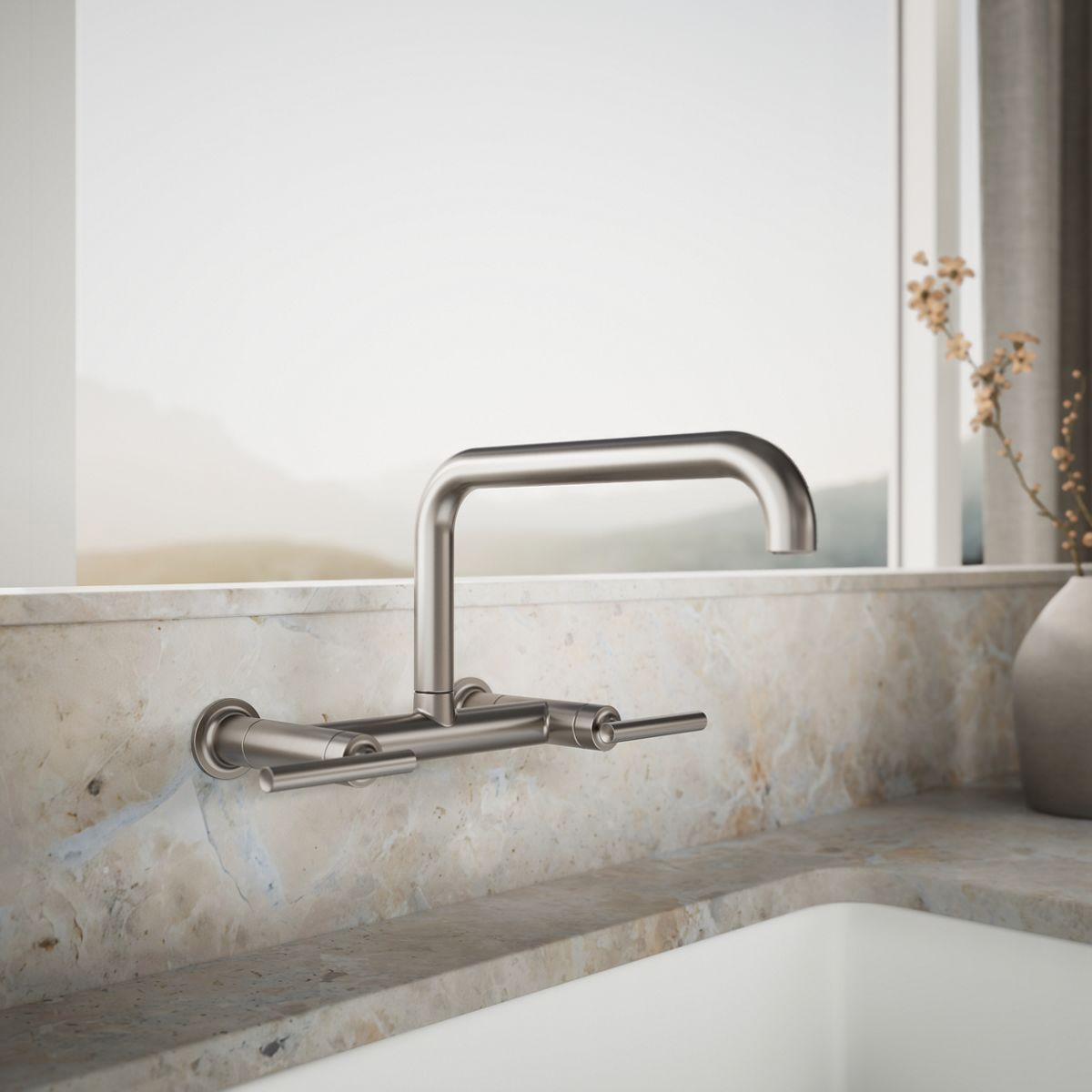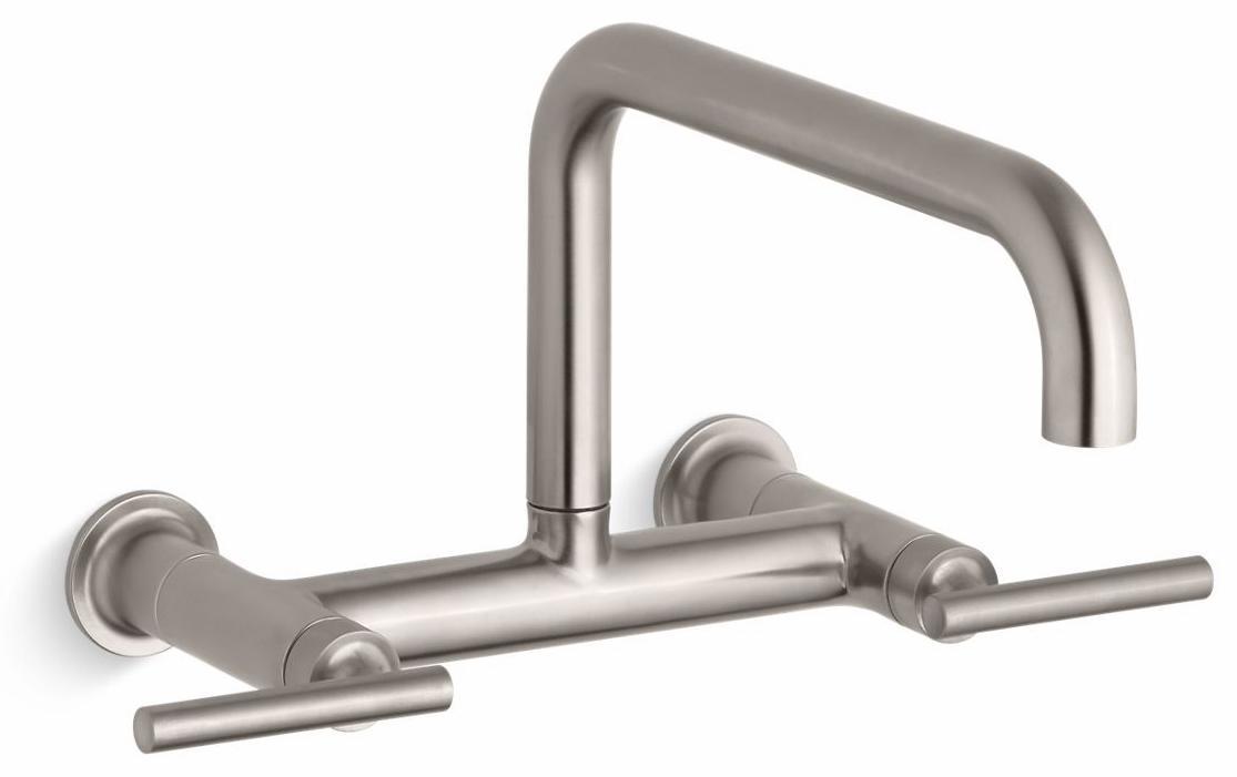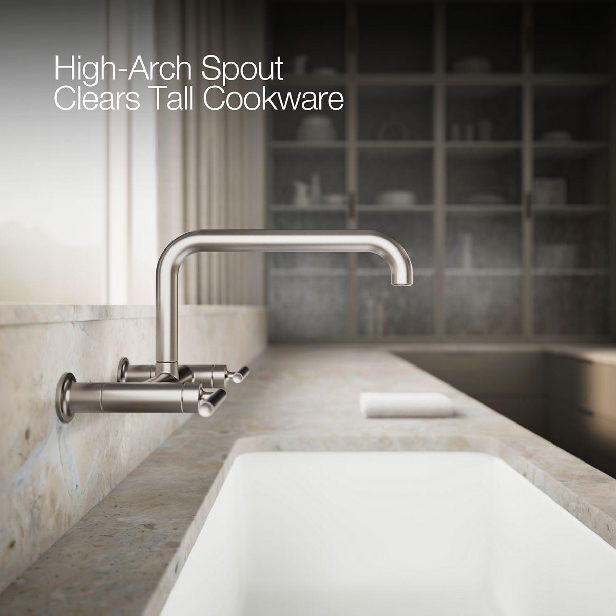 Pairing a classic bridge design with bold new touches, this Purist kitchen faucet combines distinctive modern style and easy-to-use features. Ideal for larger sinks, the high-arch spout provides 13-7/8 inches of reach and rotates 360 degrees, clearing the way for your largest pots and pans. Extended lever handles offer plenty of grip area.