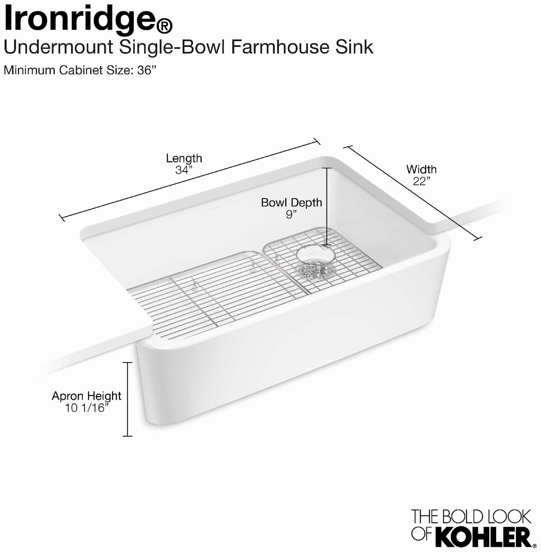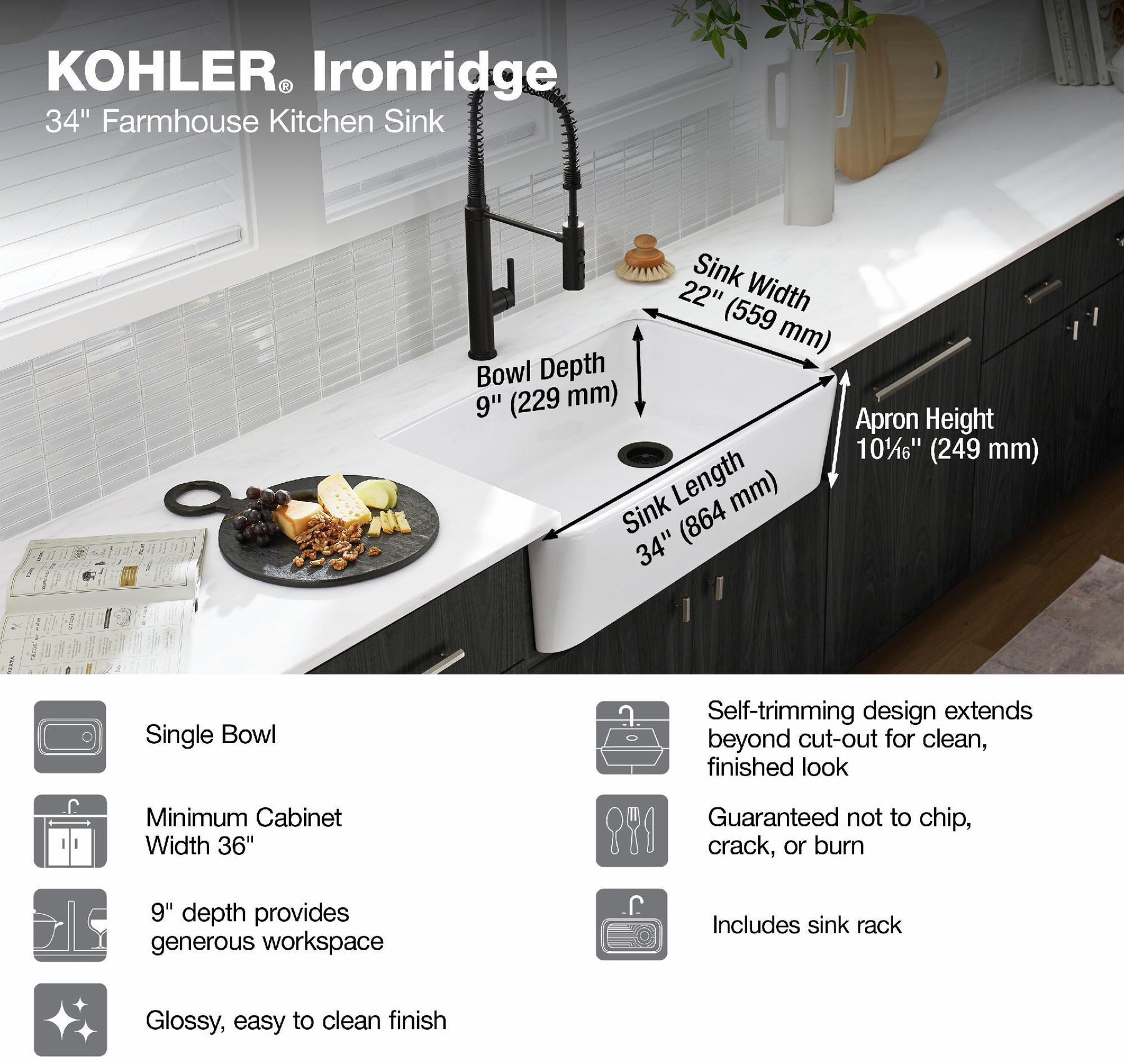- Fits minimum 36" (914 mm) apron sink base cabinet