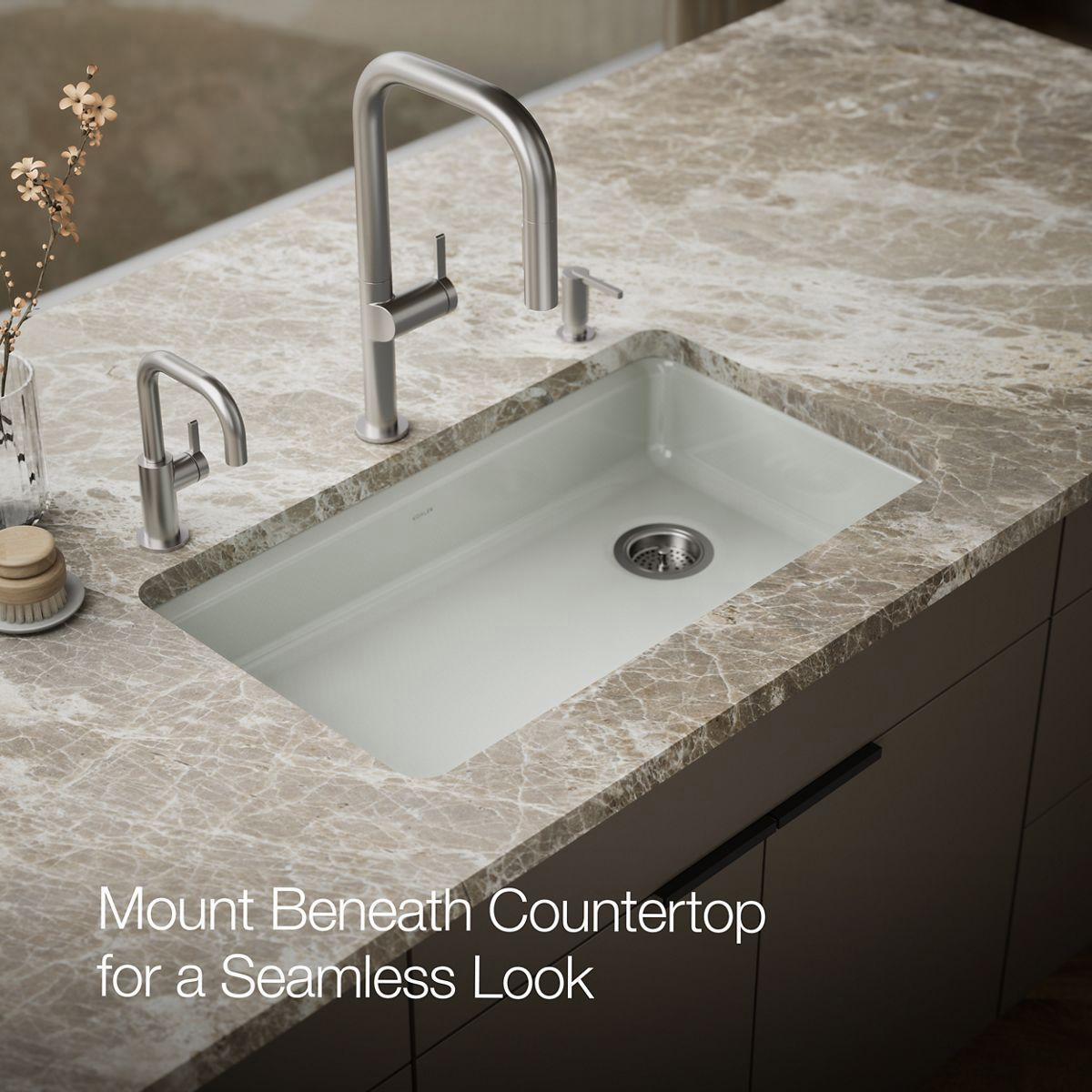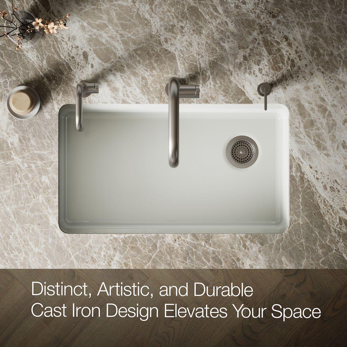 The understated beauty of this ADA-compliant Riverby sink makes it an elegant and versatile addition to the kitchen. A single, large bowl provides ample space to soak and wash cookware, while a sloped base to a single offset drain minimizes water pooling. Crafted from enameled cast iron, this sink resists chipping, cracking, or burning for years of beauty and reliable performance.