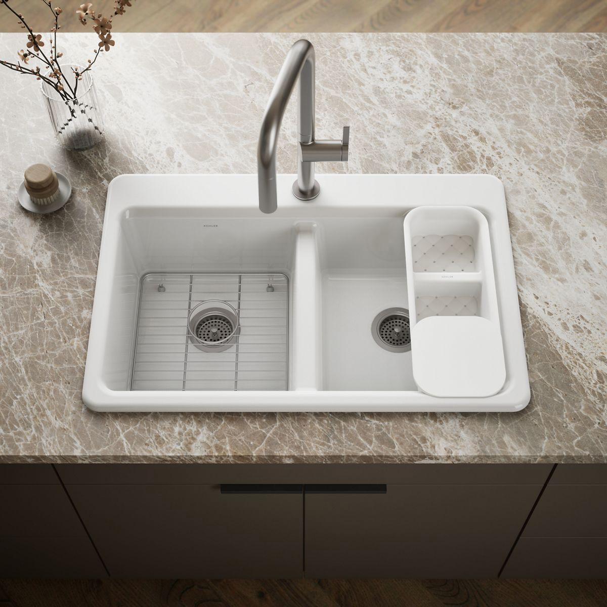Riverby 33" 1-Hole 2 Bowl Top Mount Workstation Kitchen Sink - White 8679-1A2-0 Kohler