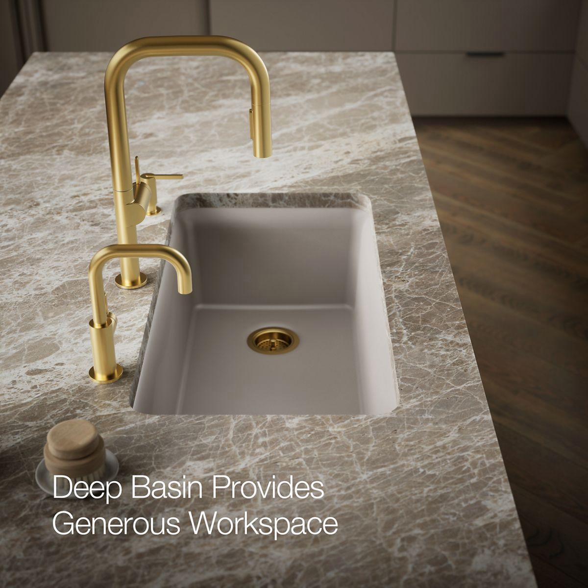 With soft French curves, the Cairn sink offers transitional style to suit contemporary and traditional kitchens alike. The Cairn sink is made of KOHLER Neoroc, a matte-finish composite material designed for extreme durability and unmatched beauty. Richly colored to complement any countertop, Neoroc resists scratches, stains, and fading and is highly heat- and impact-resistant. This sink includes a bottom sink rack to keep the surface looking new.
