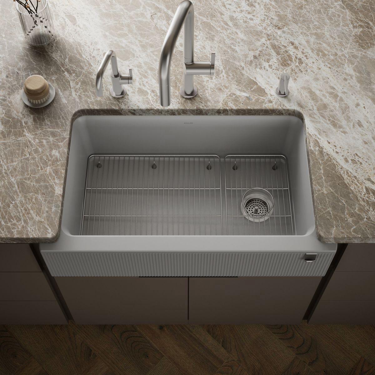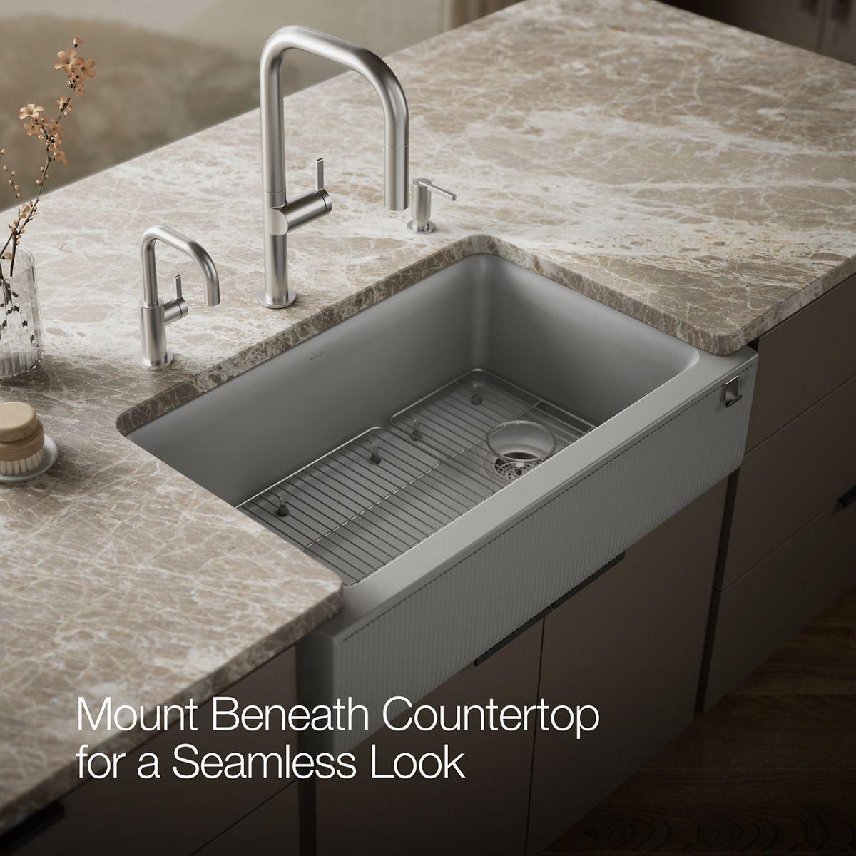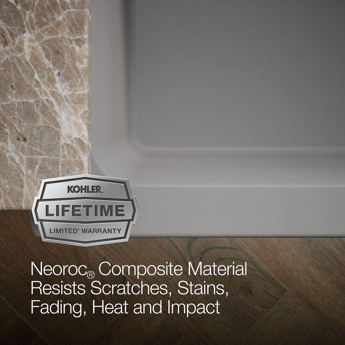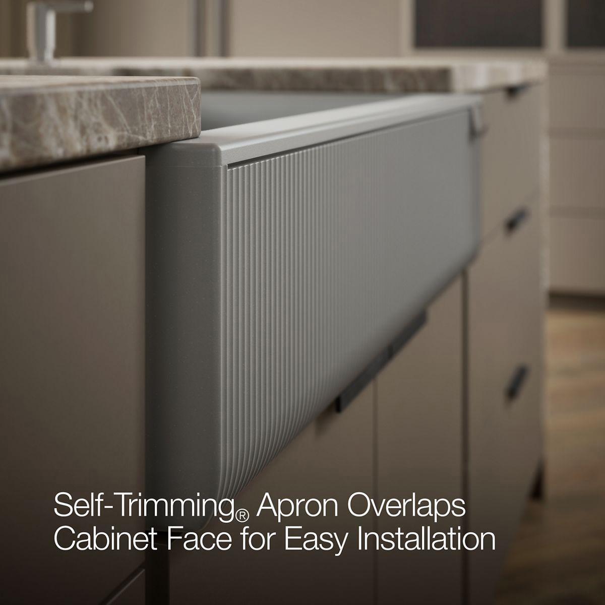 With soft French curves, the Cairn kitchen sink offers transitional style to suit contemporary and traditional kitchens alike. Cairn is made of KOHLER Neoroc, a matte-finish composite material designed for extreme durability and unmatched beauty. Richly colored to complement any countertop, Neoroc resists scratches, stains, and fading, and is highly heat- and impact-resistant. A standard tall apron-front makes it easy to install on 36-inch apron-front cabinetry. The Self-Trimming design requires only a simple rough cut, overlapping the cabinet face for beautiful results.