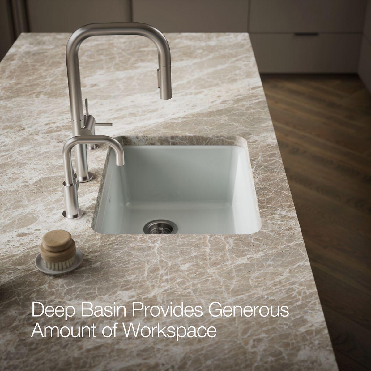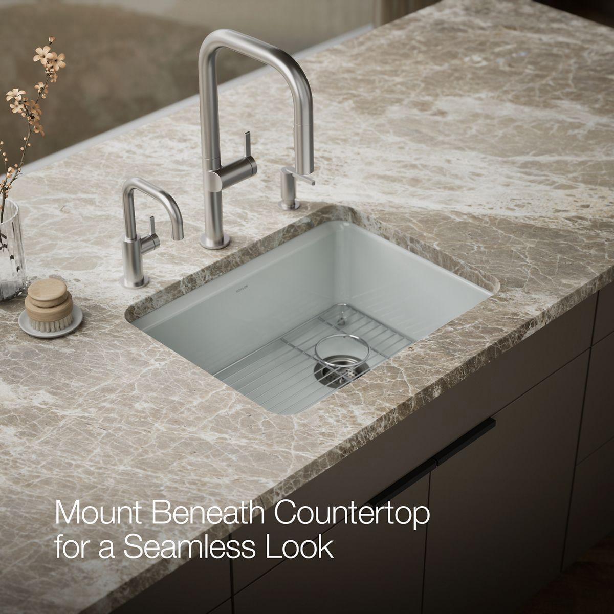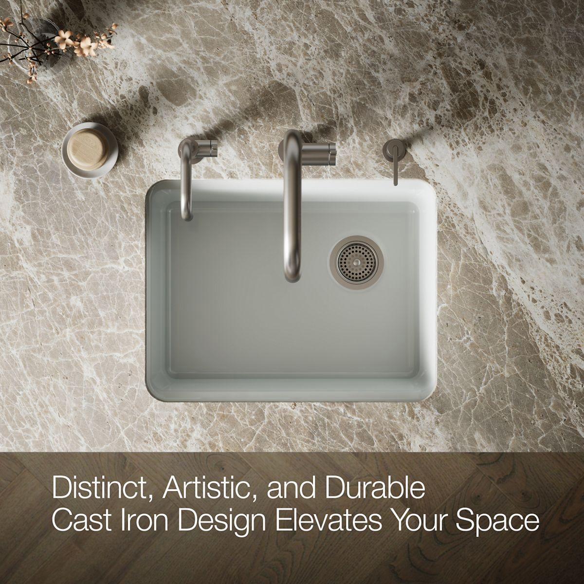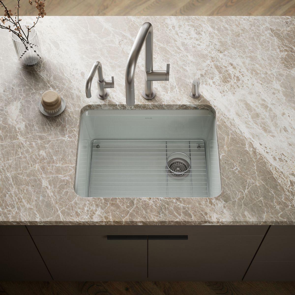 Sized to fit small spaces, the Riverby sink is an elegant and versatile addition to the kitchen as a primary, secondary, bar, or utility sink. A single-bowl provides ample space to soak and wash large items, while front and back beveled edges help keep water in the sink. A sloped base to a single offset drain minimizes water pooling. Crafted from enameled cast iron, this sink resists chipping, cracking, or burning for years of beauty and reliable performance. An included custom-fit sink rack also helps protect the sink surface from daily wear.