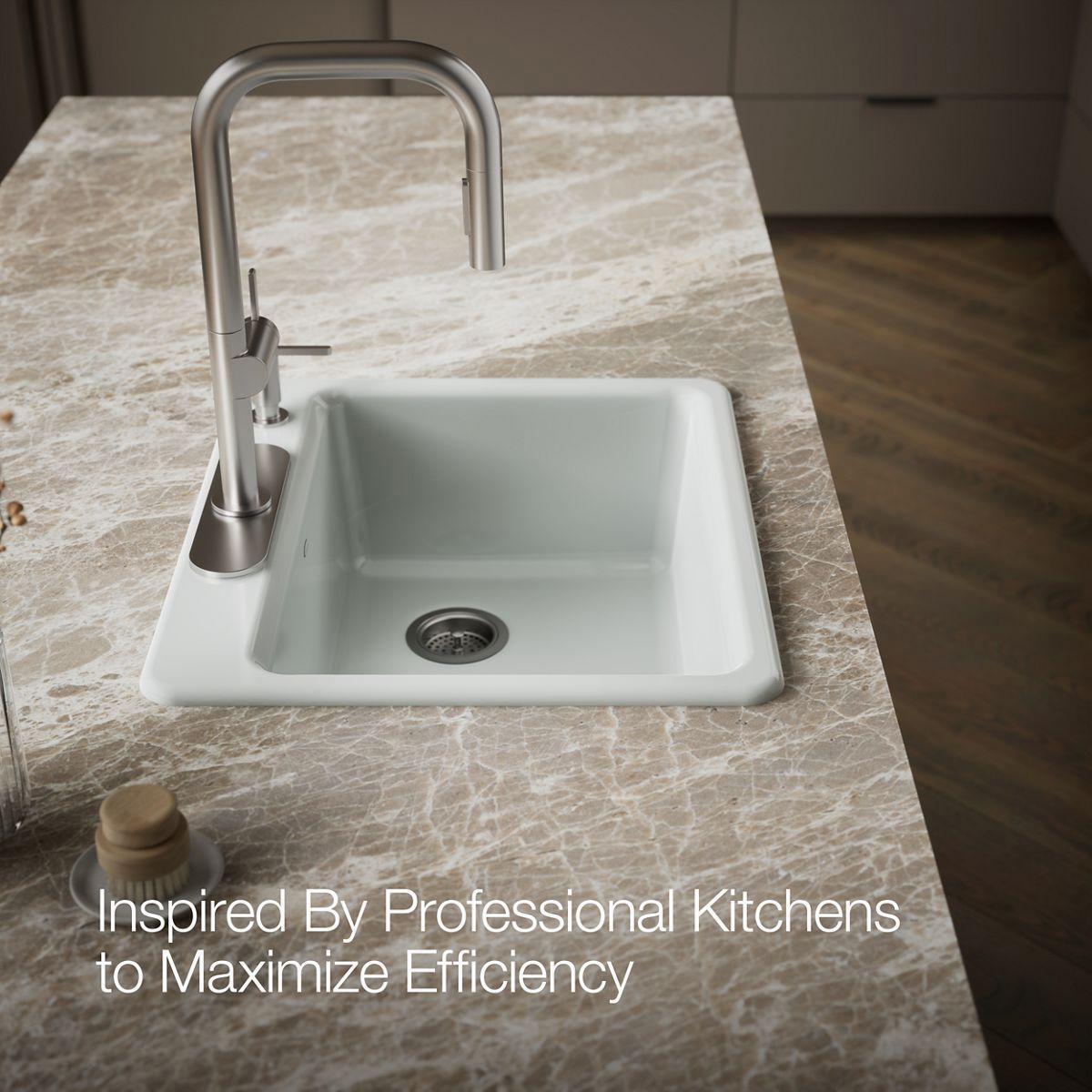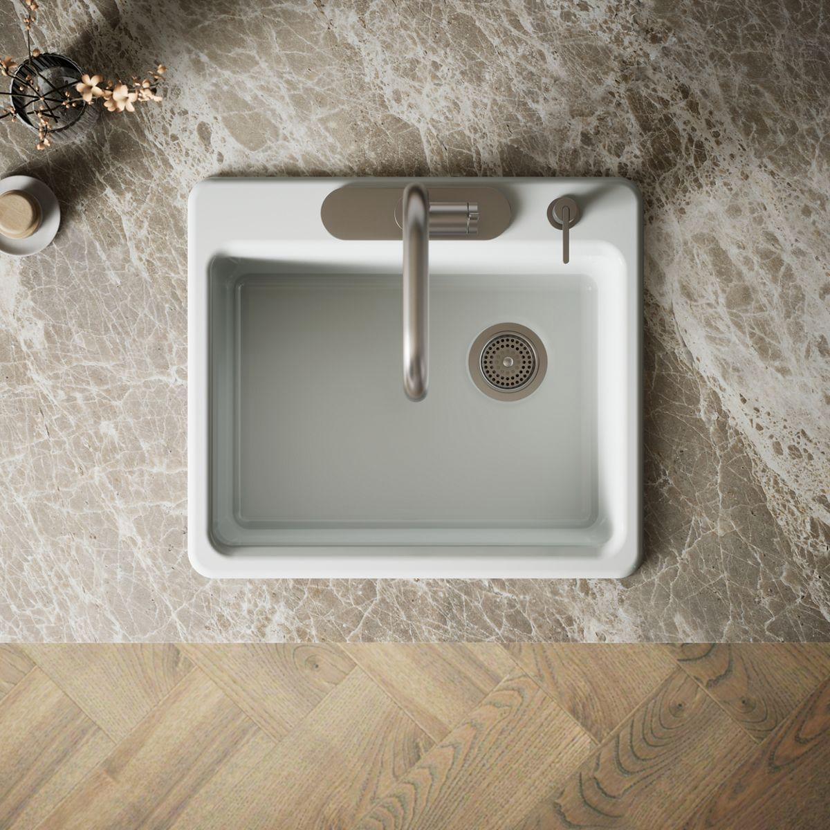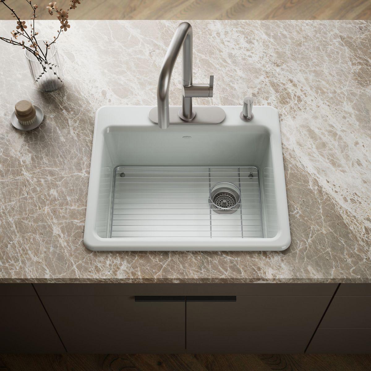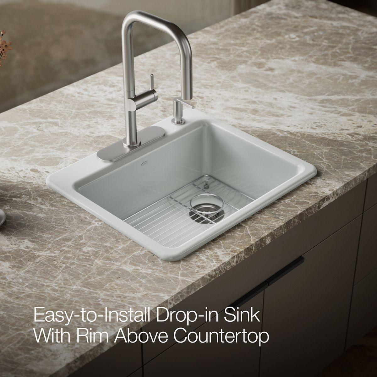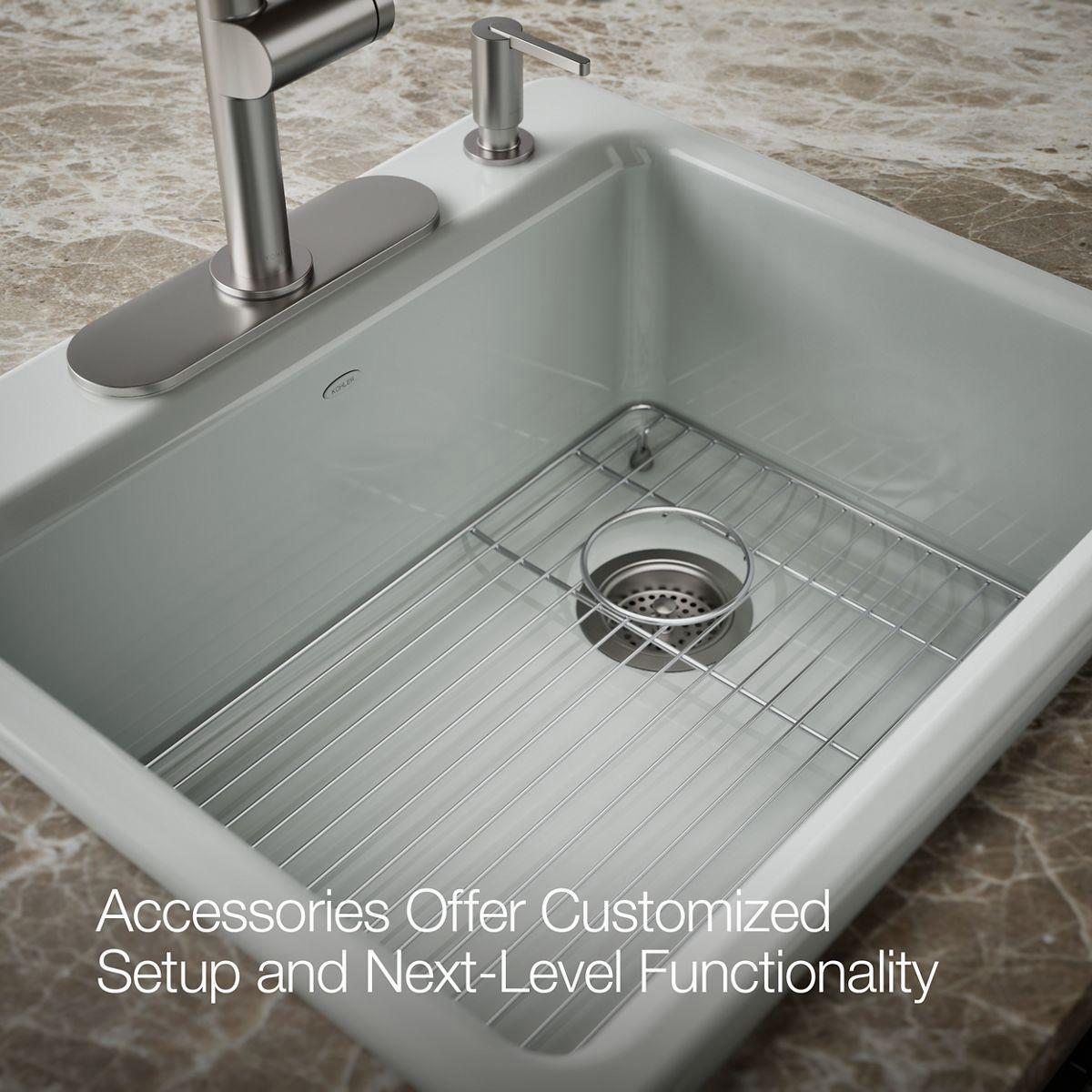 Sized to fit small spaces, the Riverby sink is an elegant and versatile addition to the kitchen as a primary, secondary, bar, or utility sink. A single bowl provides ample space to soak and wash large items, while front and back beveled edges help keep water in the sink. A sloped base to a single offset drain minimizes water pooling. Crafted from enameled cast iron, this sink resists chipping, cracking, or burning for years of beauty and reliable performance. An included custom-fit bottom sink rack also helps protect the sink surface from daily wear.