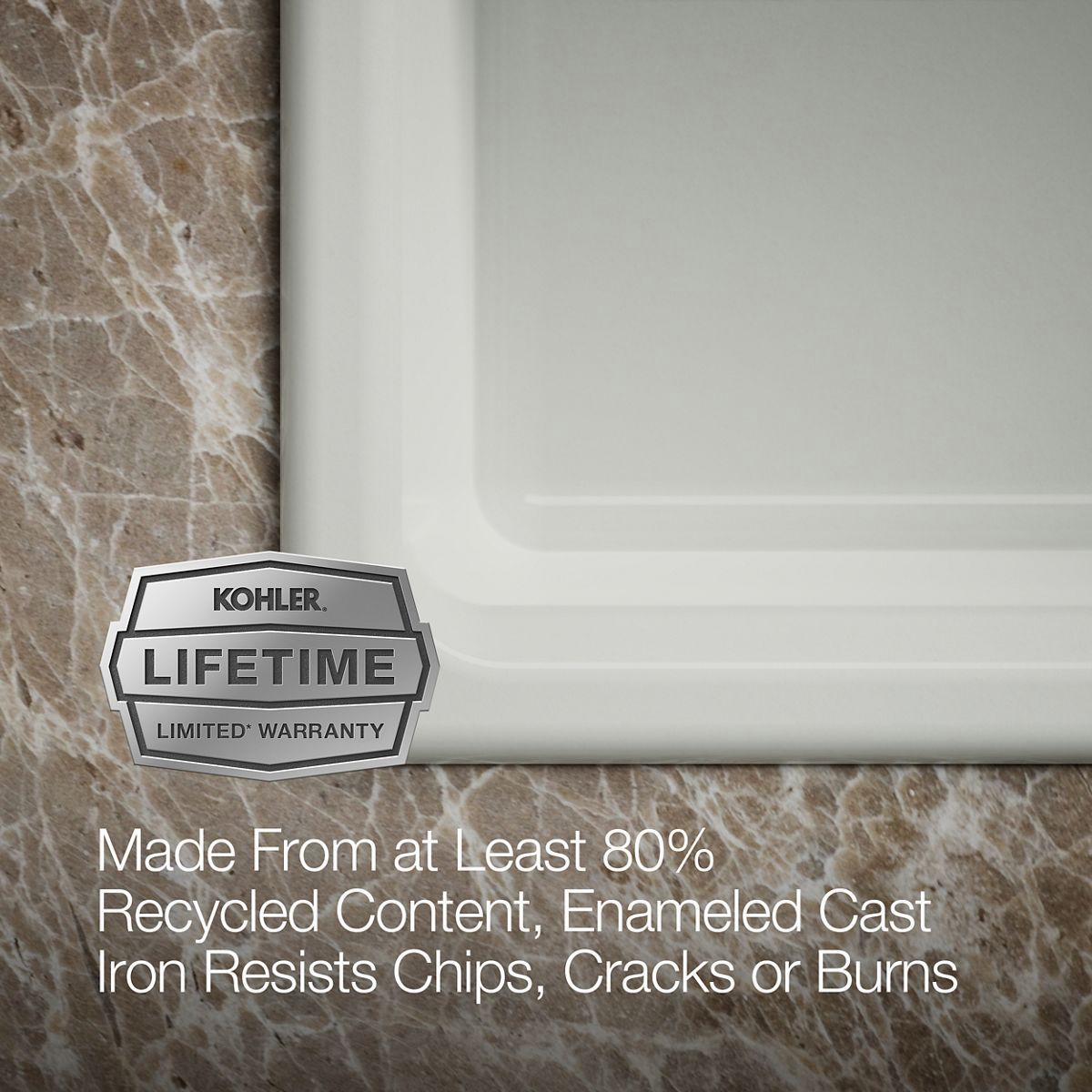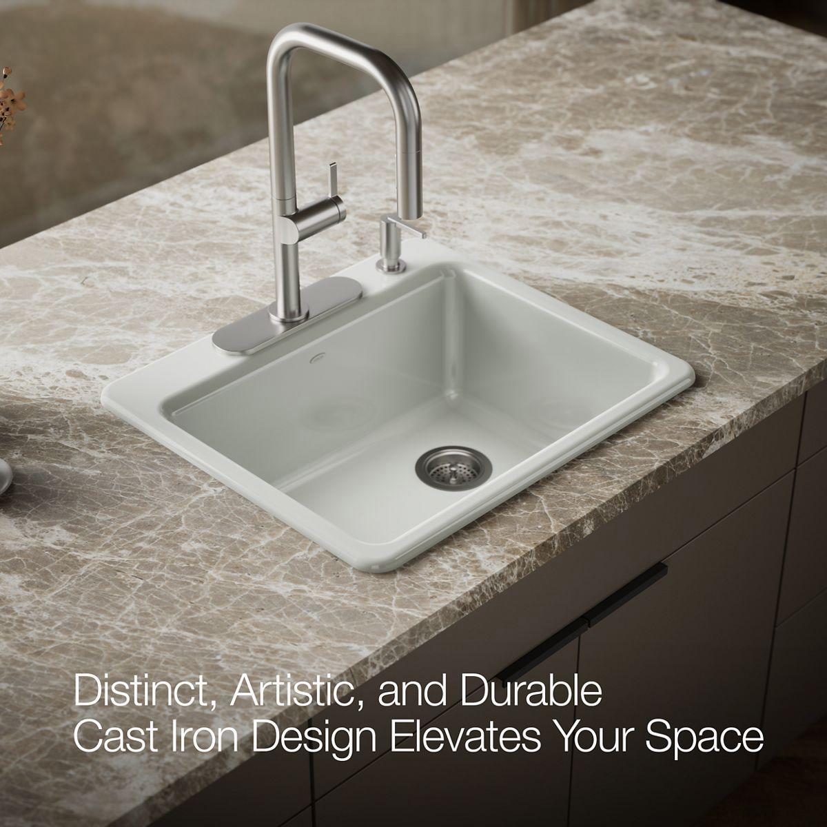 Sized to fit small spaces, the Riverby sink is an elegant and versatile addition to the kitchen as a primary, secondary, bar, or utility sink. A single bowl provides ample space to soak and wash large items, while front and back beveled edges help keep water in the sink. A sloped base to a single offset drain minimizes water pooling. Crafted from enameled cast iron, this sink resists chipping, cracking, or burning for years of beauty and reliable performance. An included custom-fit bottom sink rack also helps protect the sink surface from daily wear.