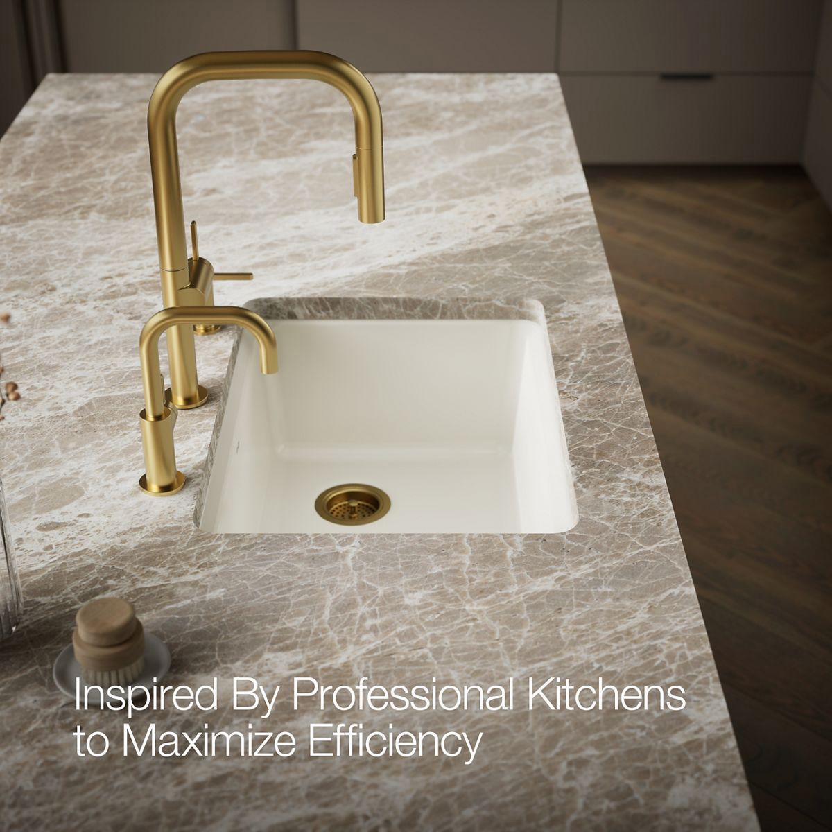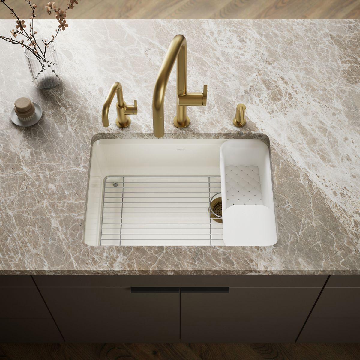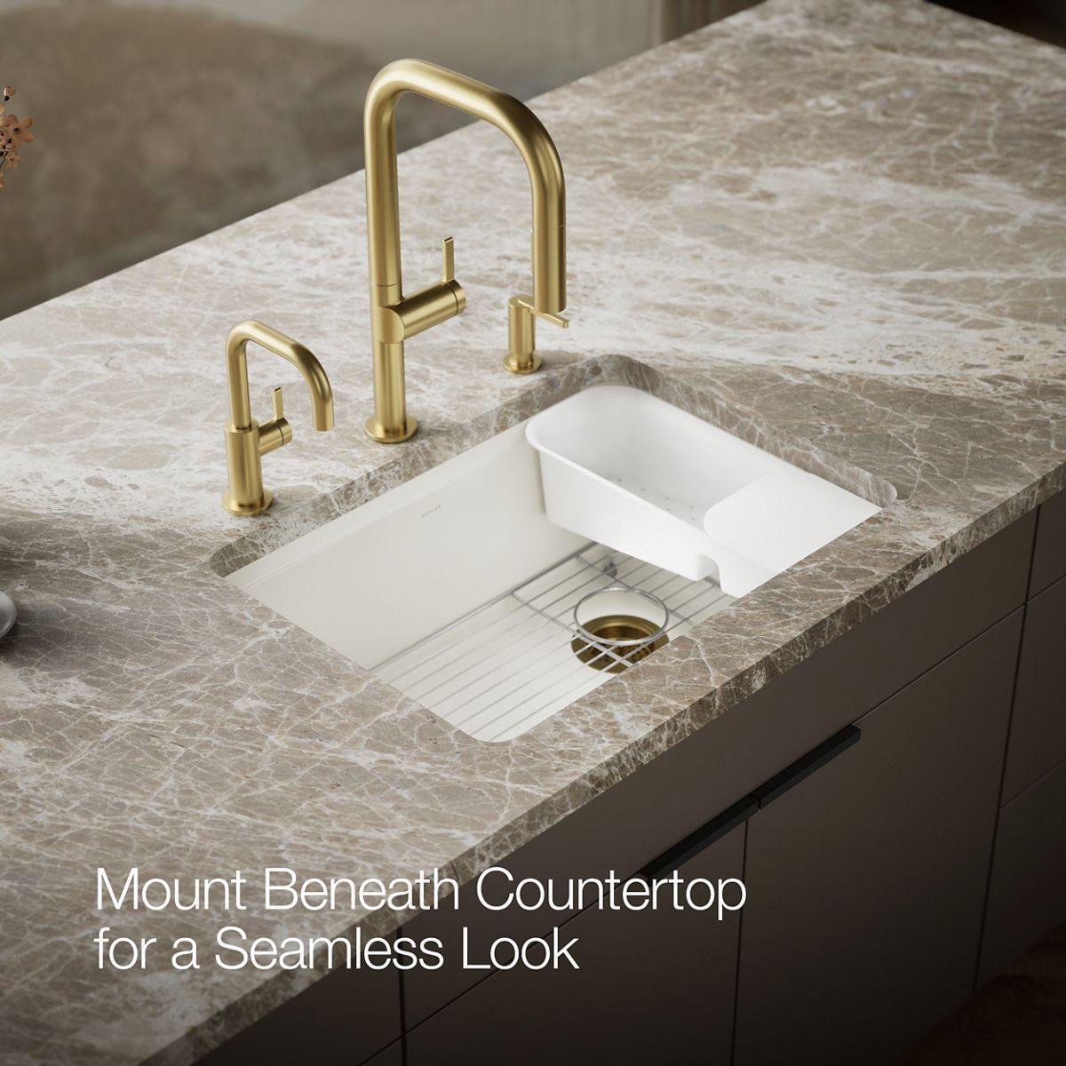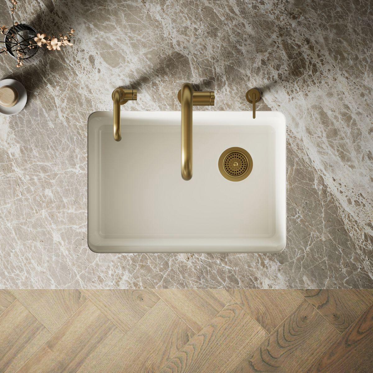 The understated beauty of this Riverby sink makes it an elegant and versatile addition to the kitchen. A single, large bowl provides ample space to soak and wash cookware, while a sloped base minimizes water pooling. Crafted from enameled cast iron, this sink resists chipping, cracking, or burning for years of beauty and reliable performance. It comes with a custom-fit colander with integral cutting board and a stainless-steel bottom sink rack.