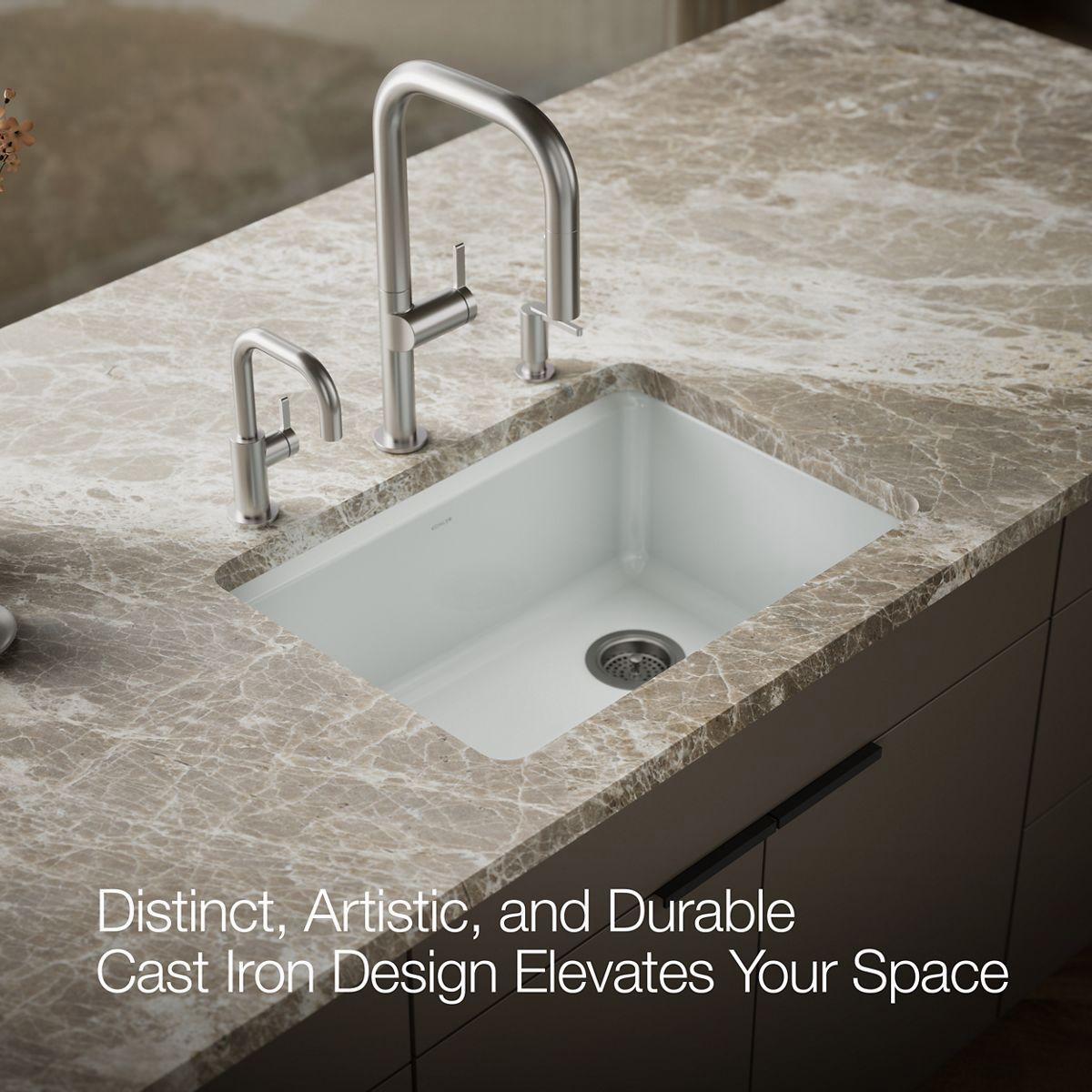 The understated beauty of this Riverby sink makes it an elegant and versatile addition to the kitchen. A single, large bowl provides ample space to soak and wash cookware, while a sloped base minimizes water pooling. Crafted from enameled cast iron, this sink resists chipping, cracking, or burning for years of beauty and reliable performance. It comes with a custom-fit colander with integral cutting board and a stainless-steel bottom sink rack.