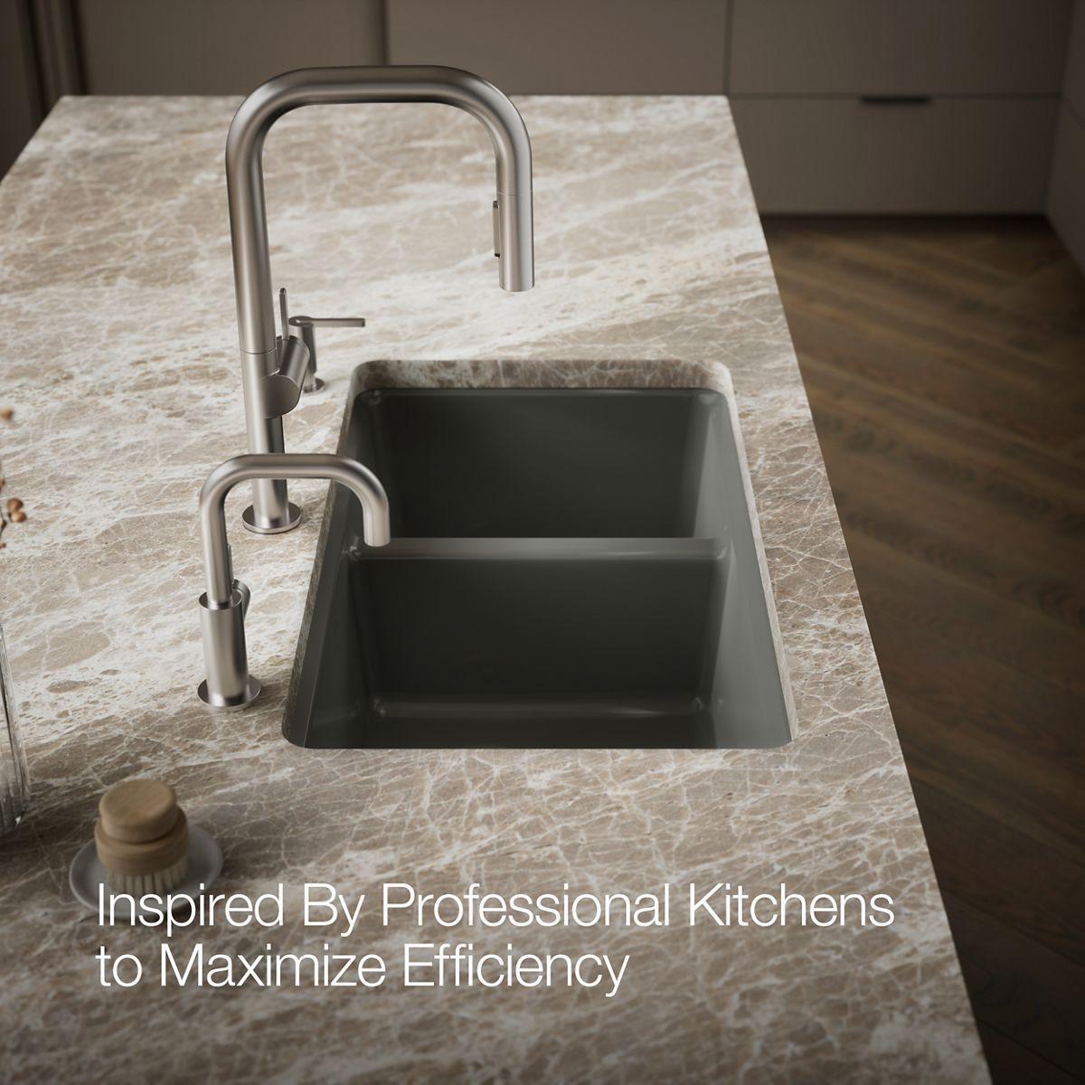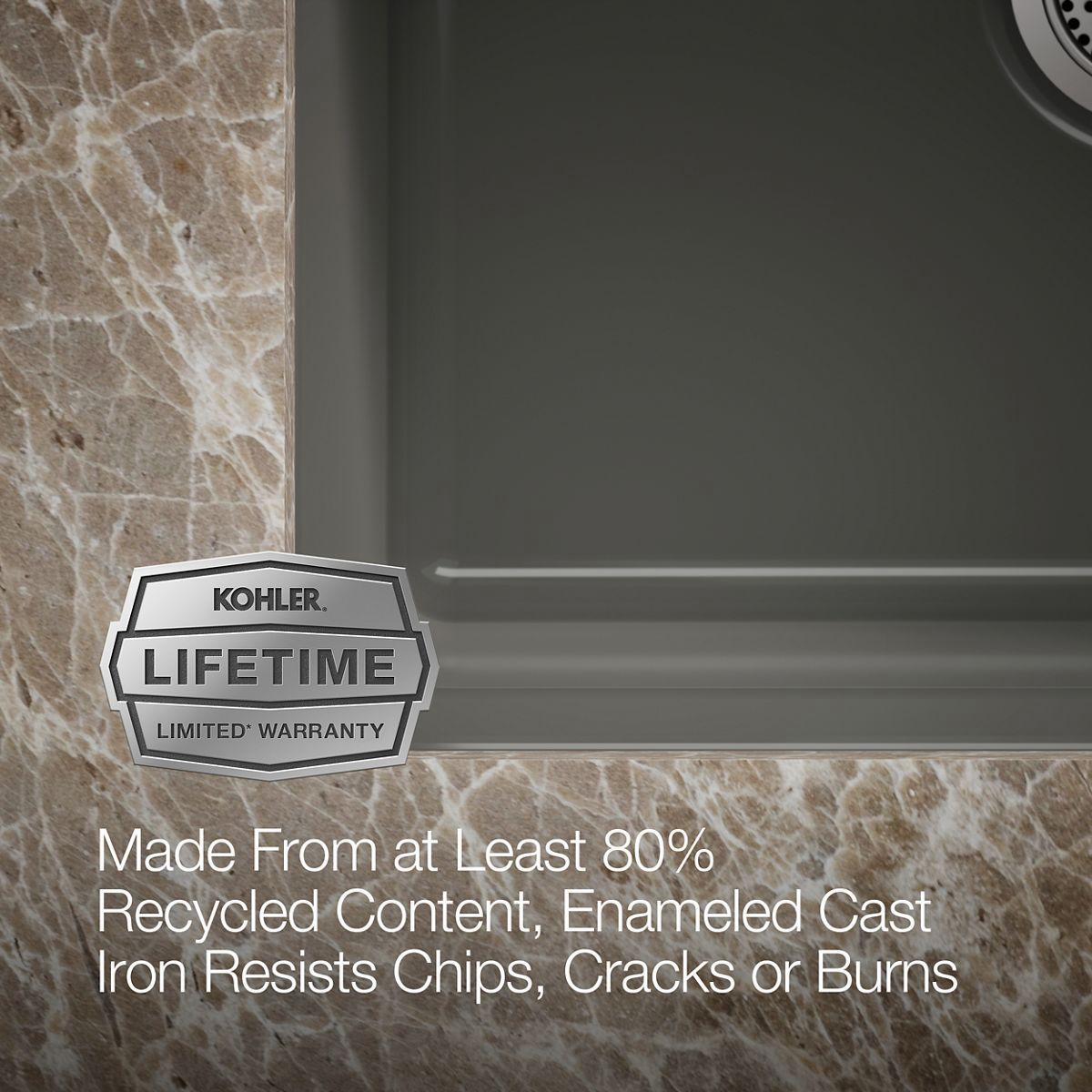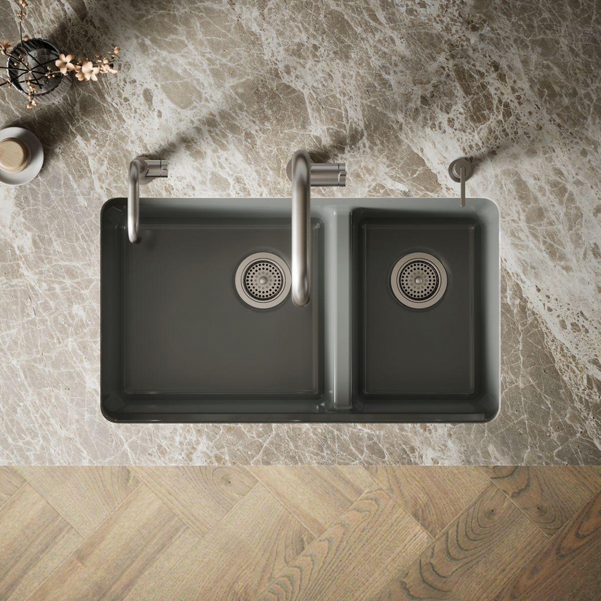 The understated beauty of this Riverby sink makes it an elegant and versatile addition to the kitchen. The large/medium bowls allow you to keep clean and dirty dishes separate, while a sloped base minimizes water pooling. Crafted from enameled cast iron, this sink resists chipping, cracking, or burning for years of beauty and reliable performance. It comes with a custom-fit colander with integral cutting board, a utility rack with soaking cup, and a stainless-steel bottom sink rack.