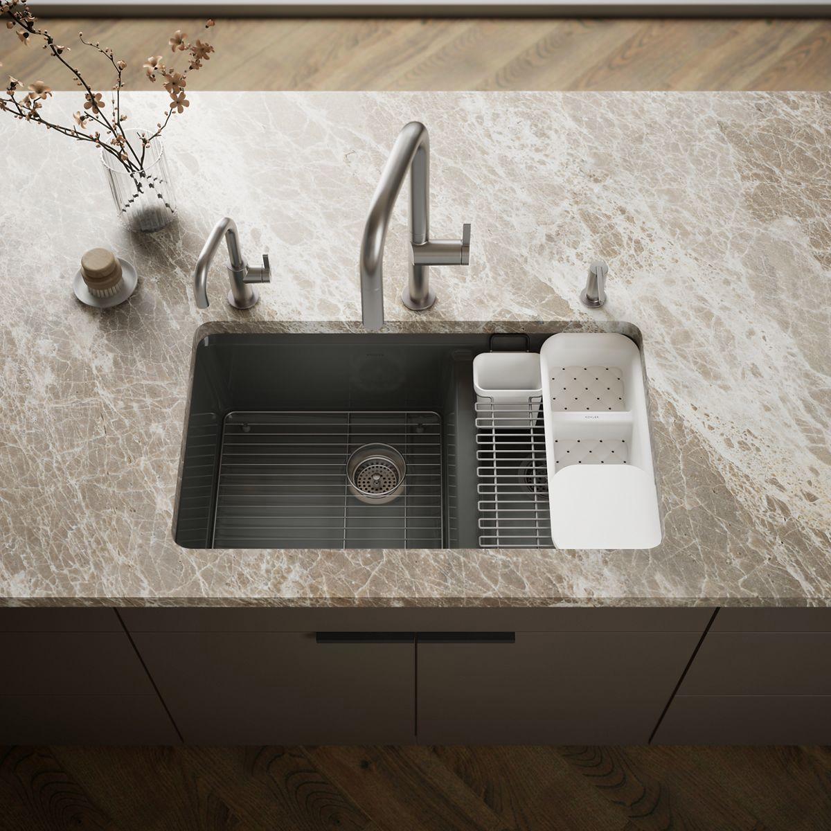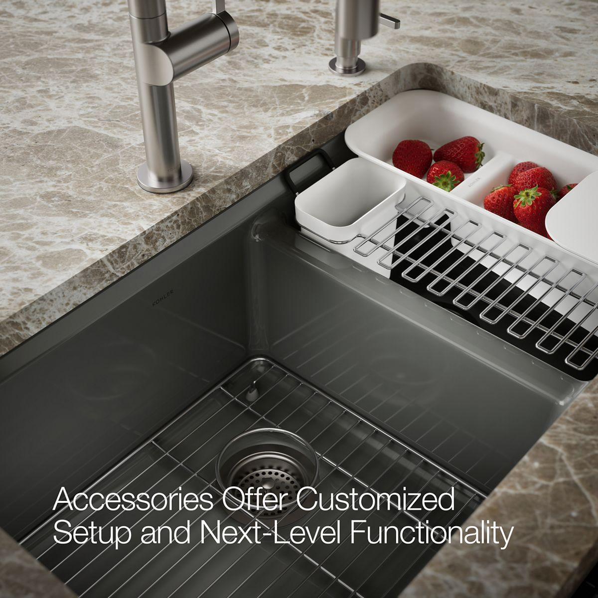 - Includes K-6239 colander with integral cutting board, K-6194 utility rack with soaking cup, and K-9234 left-hand bottom sink rack.