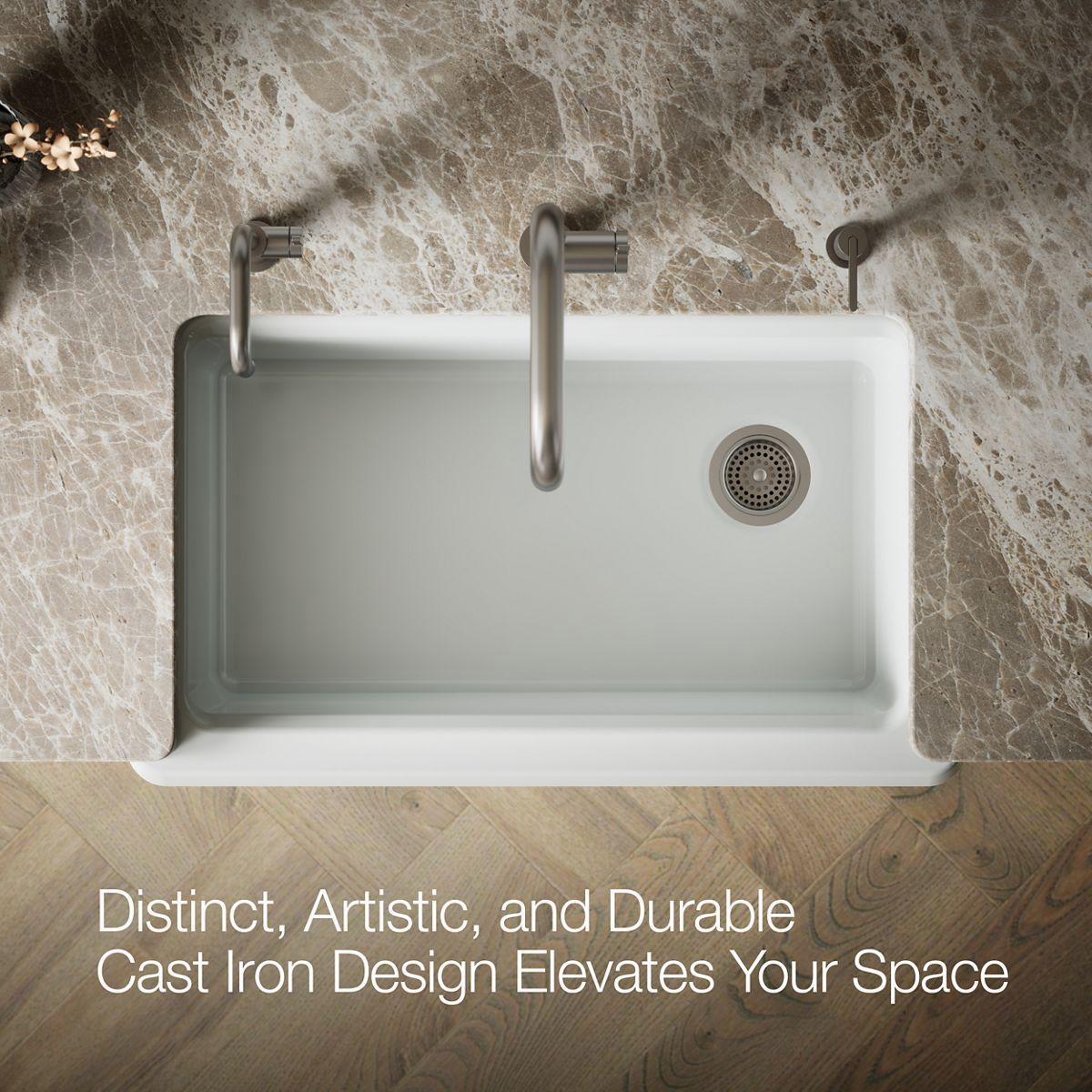 Inspired by professional chefs and designed around real-life routines, Riverby streamlines your kitchen tasks with accessories that make prepping, cooking, and cleaning a breeze. The understated beauty of this Riverby sink makes it an elegant and versatile addition to the kitchen. A single, large bowl provides ample space to soak and wash cookware, while a sloped basin to an offset drain minimizes water pooling. Crafted from enameled cast iron, this sink resists chipping, cracking, or burning for years of beauty and reliable performance.