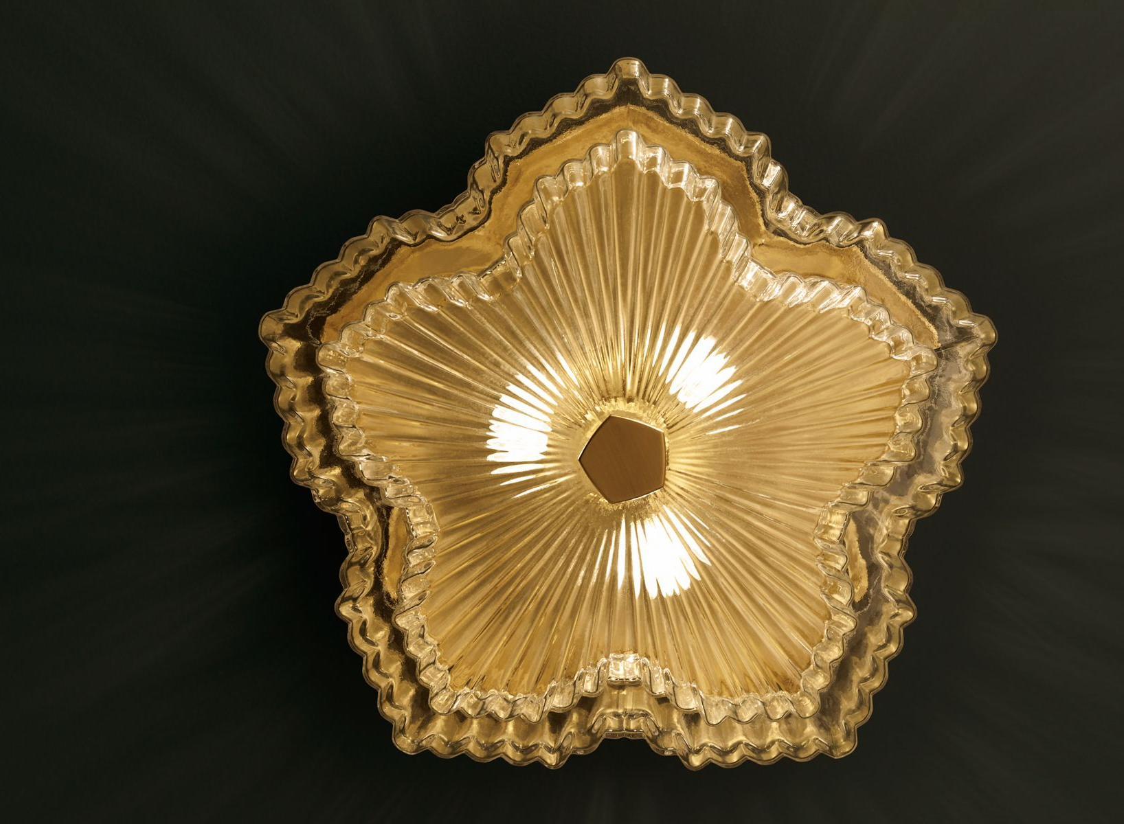 - Ridged cylindrical glass shades combine with faceted metals in vintage-inspired fixtures elegant enough for any room.
