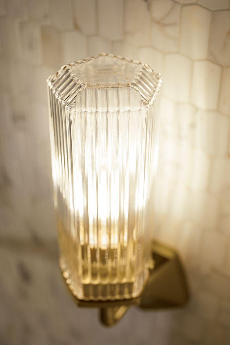 • Ridged cylindrical glass shades combine with faceted metals in vintage-inspired fixtures elegant enough for any room.