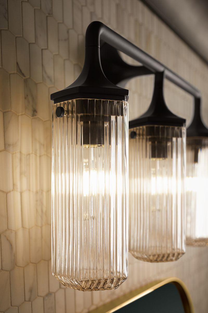 • Ridged cylindrical glass shades combine with faceted metals in vintage-inspired fixtures elegant enough for any room.