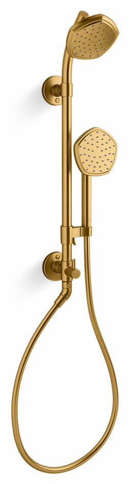 Unapologetically luxurious and truly unforgettable, Occasion bathroom faucets and accessories draw inspiration from 1960s Hollywood glamour and extravagance. Fashioned after the era’s sleek dress lines and bold car designs, the Occasion collection reflects graceful elegance with distinctive pentagonal accents, faceted bases, flowing lines, and delicate edges. Blending classic design with modern details and function, this water-conserving 1.75 gpm shower column kit includes an 45-nozzle showerhead, 45-nozzle handshower, HydroRail-S shower column with handshower holder, and hose. Combine with coordinating valve trim and accessories to create your signature bathroom design.